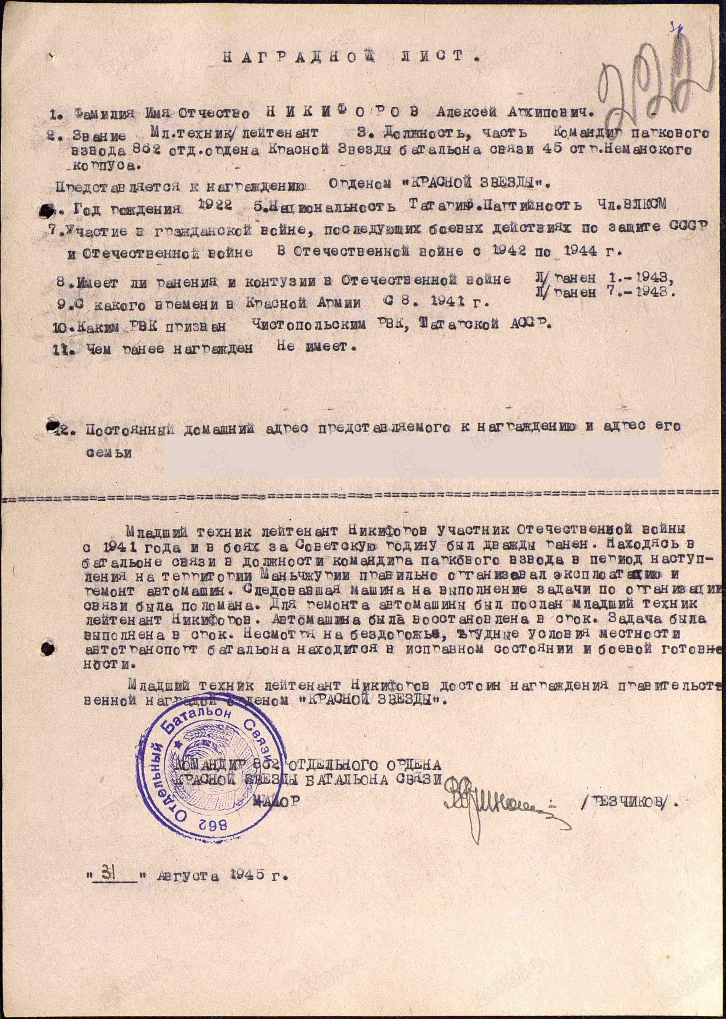 Алексей Архипович Никифоров родился 15 марта 1922 года в с.Белая Горка, Чистопольского района, ТАССР. В августе 1941 г. призван в ряды Красной Армии Чистопольским военным комиссариатом. Служил в звании лейтенанта, в должности командира паркового взвода 862 отд.батальона связи. Дважды был ранен (в январе и июле 1943 г.).