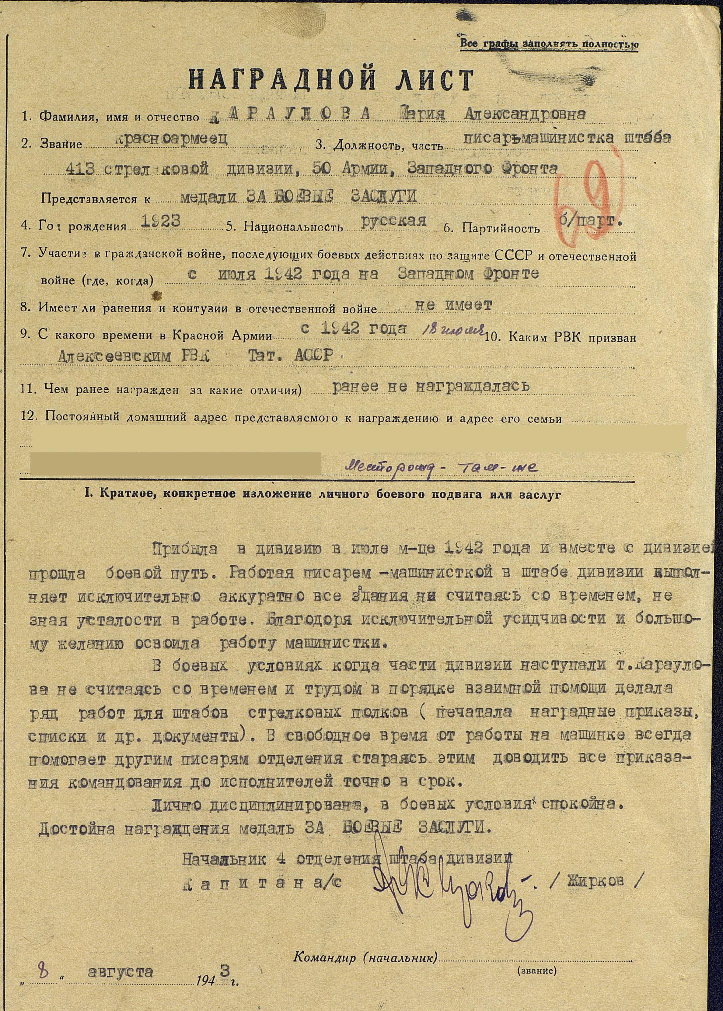 НИКУЛИНА (КАРАУЛОВА) Мария Александровна, 1923, с. Алексеевское. До призыва в армию работала счетоводом. Мобилизована Алексеевским РВК 22 июля 1942. Красноармеец, писарь-машинистка штаба 413 СД 50 А Западного/ Брянского/ Белорусского/ 1 Белорусского фронта. Демобилизована в июле 1944. Награждена медалью «За боевые заслуги», орденом Отечественной войны 2 ст. (1985). После войны жила в г. Мелеуз, БашАССР.