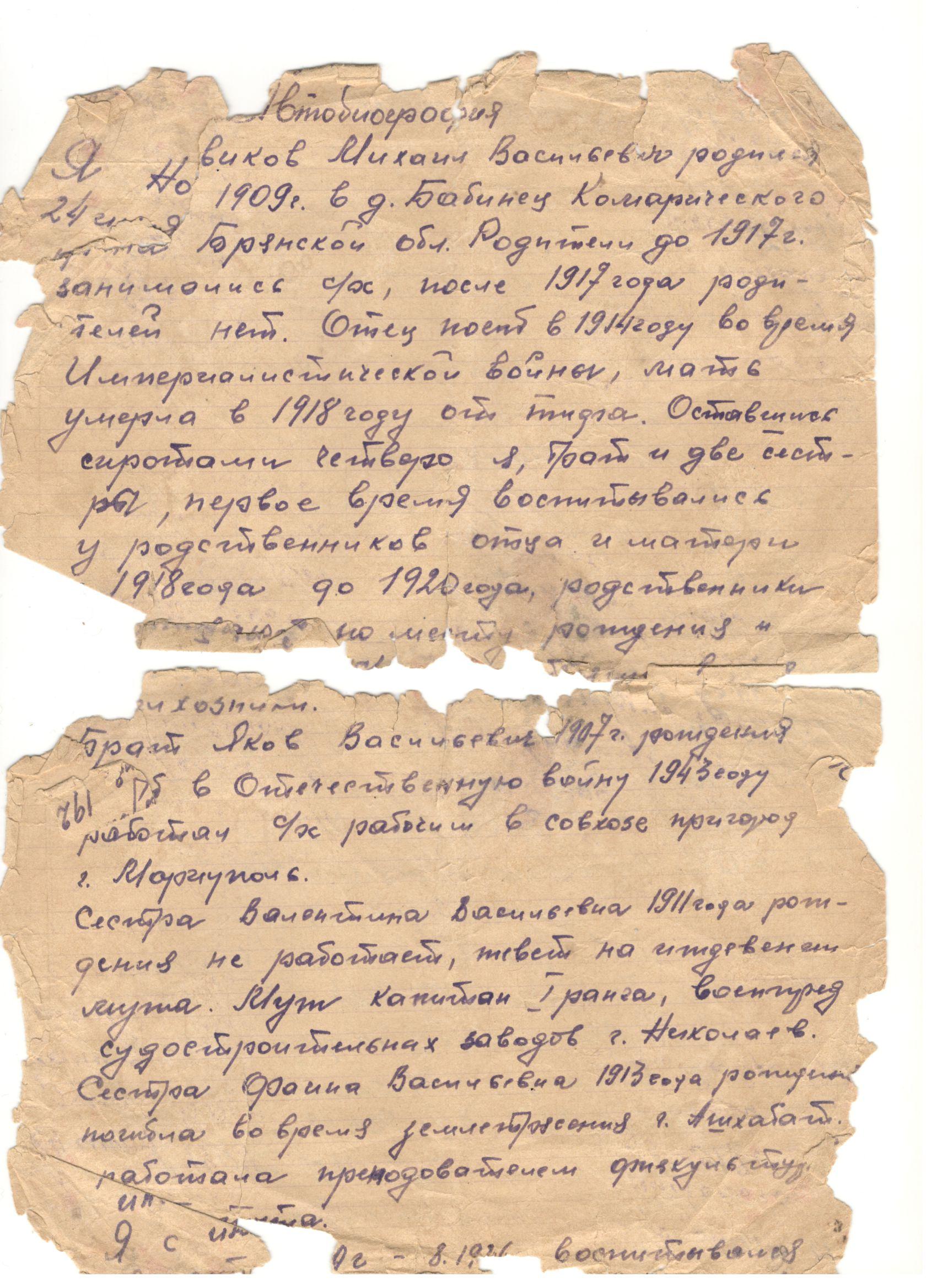 1920-1926 гг.- воспитывался в детском доме (г.Севск Брянской области, закончил там школу-семилетку.