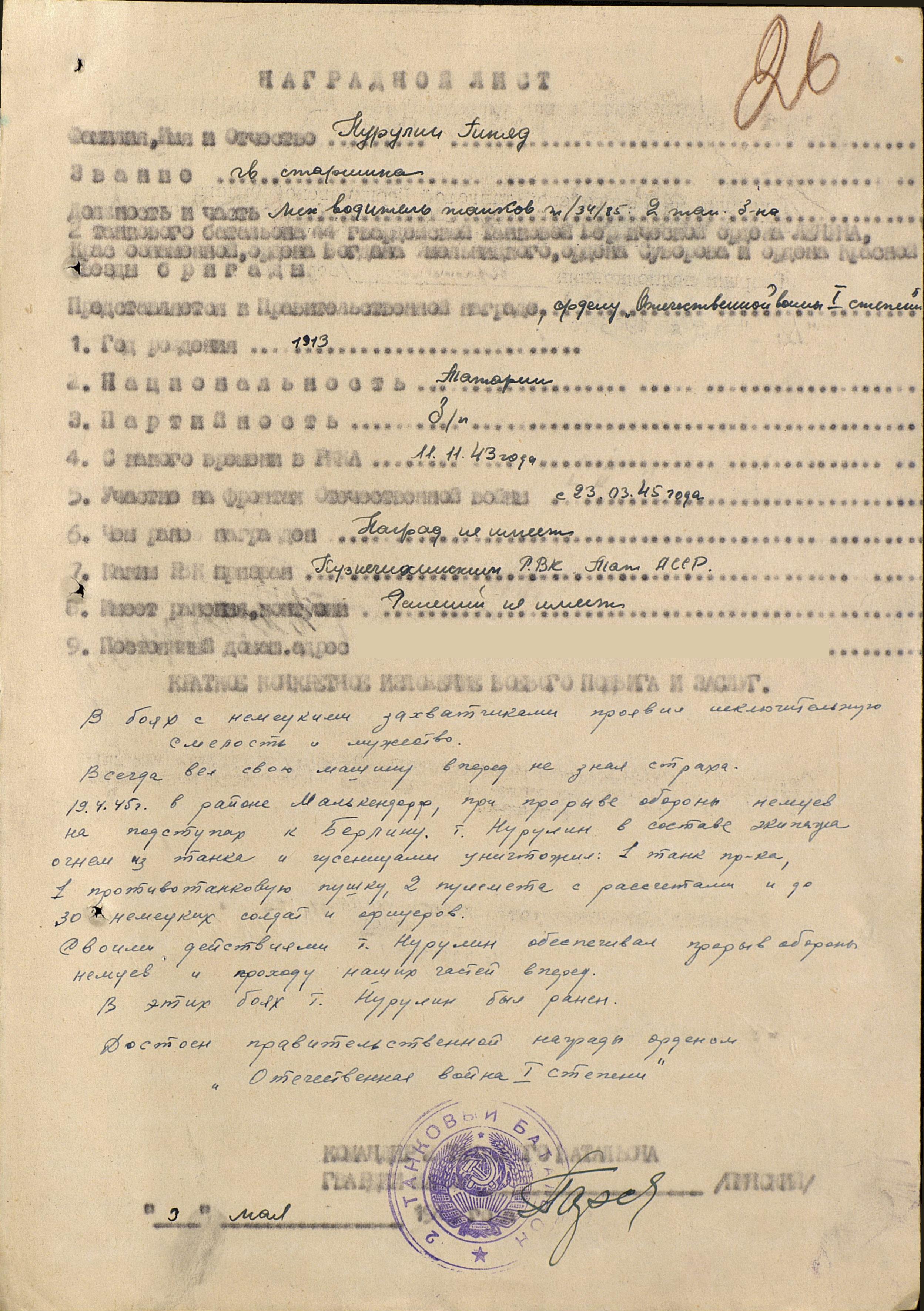 Родился в 1913 г. в с. М. Елги Лаишевского уезда. Мобилизован Кузнечихинским РВК в 1943 г. (согласно наградному листу). На фронте с марта 1945 г. Гв. старшина, механик-водитель танка Т-34/85 44 гв. танковой бригады 11 гв. танкового корпуса. Воевал на территории Германии, на подступах к Берлину. Отличился в бою 19 апреля 1945 г. в районе н.п. Малькендорф, уничтожив в составе экипажа 1 танк противника, 1 противотанковую пушку, 2 пулемёта с расчётами и до 30 солдат противника. В этом бою был ранен. Награждён орденами Отечественной войны 1 ст. (1945), Отечественной войны 2 ст. (1985), медалью "За победу над Германией". В базе "Повиг народа" значится под именем НУРУЛИН ГИНЯД.
