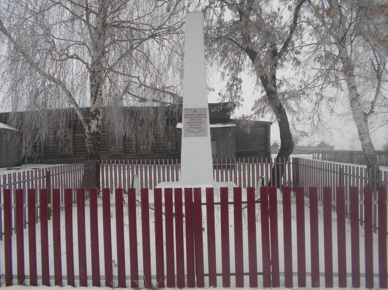 По боковым сторонам обелиска располагаются плиты с высеченными на них фамилиями погибших в годы Великой Отечественной войны 1941-1945 гг.. Размер: высота - 4м.