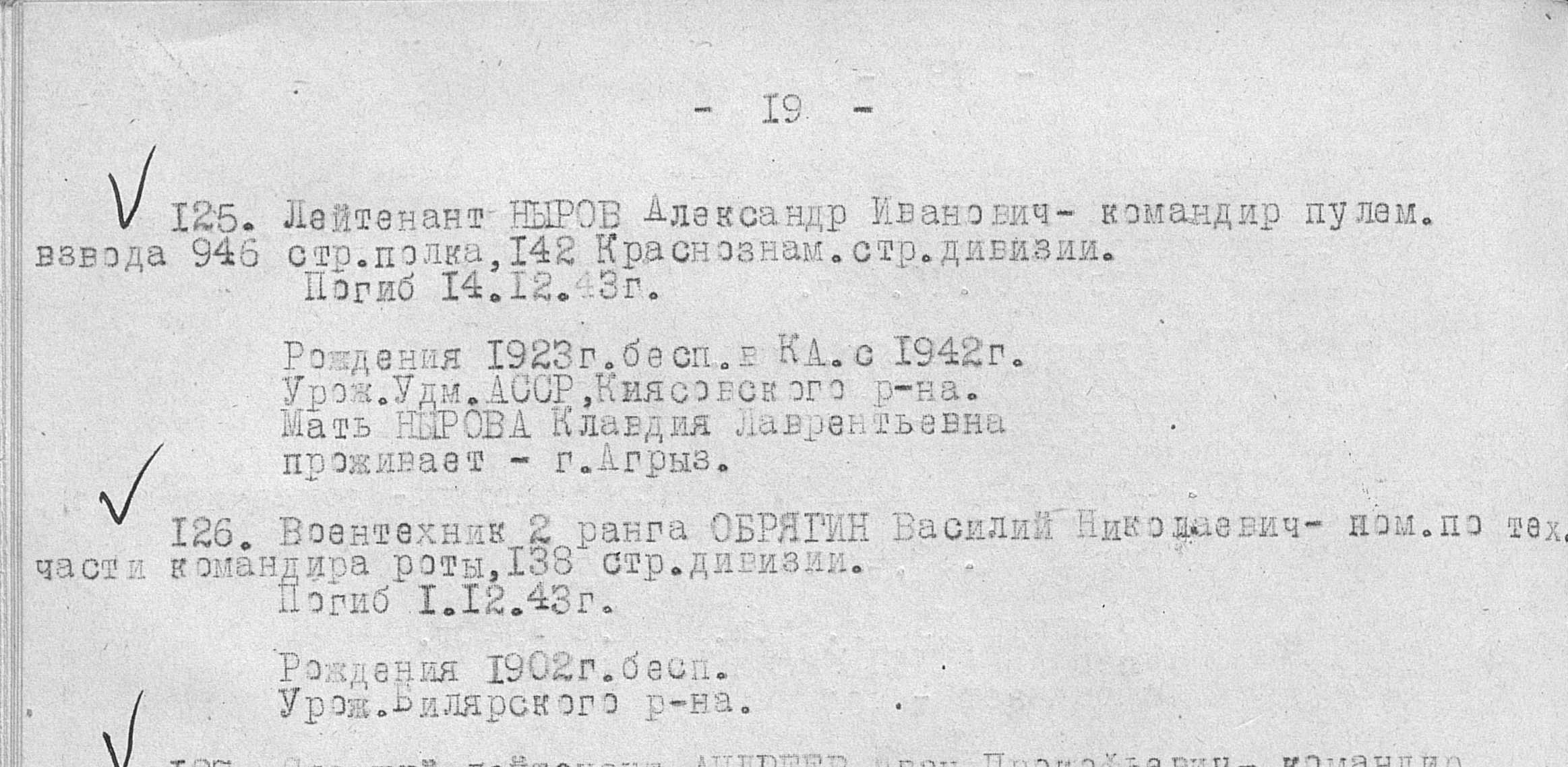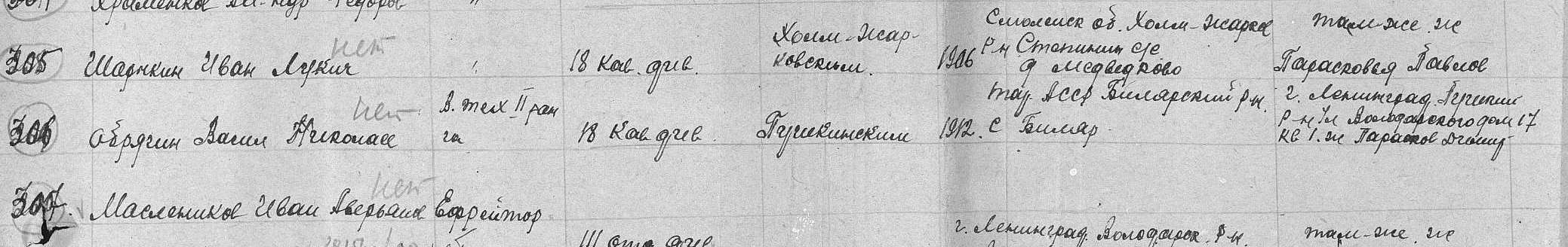 ОБРЯД(Г)ИН Василий Николаевич, 1902, уроженец с. Билярск. Моб. Пушкинским (или Павловским) РВК, Ленинградской обл. Семья проживала в Ленинграде. В/техник 2 ранга, 573 ПушАртПолк 18 КавД. После разгрома дивизии в июле 1942 г. в р-не г. Холм-Жирковского Смоленской обл. (юго-западнее Ржева) попал в плен, освобождён в 1943 г, направлен в 20 запасн. стрелков. полк. Затем - техн.-лейтенат, пом. ком. по тех. 408 ОтдАвтоРота 138 СД. Убит 1.12 1943 г., Полтавская обл., г. Кременчуг, похоронен там же.