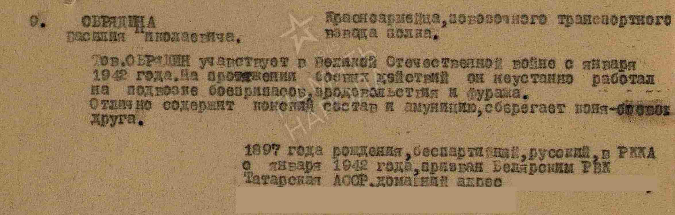 ОБРЯДИН Василий Николаевич, 1897, с. Билярск. Мобилизован 15 янв. 1942 Билярским РВК. С 29 мая 1942 воевал на Западном, Юго-Западном, 3 Украинском, 2 Украинском фронте в составе 5А/ 33 А/ 1 гв. А/ 8 гв. А/ 6 А/ 5 гв. А/ 7 гв. А/ 52 А. Участник освобождения Смоленщины, Украины, Молдавии, Польши, Чехословакии, форсирования Одера, боёв в Германии. Красноармеец, повозочный транспортного взвода 202 АП 50 СД. Награждён медалью «За боевые заслуги», орденом Отечественной войны 2 ст. (1985).
