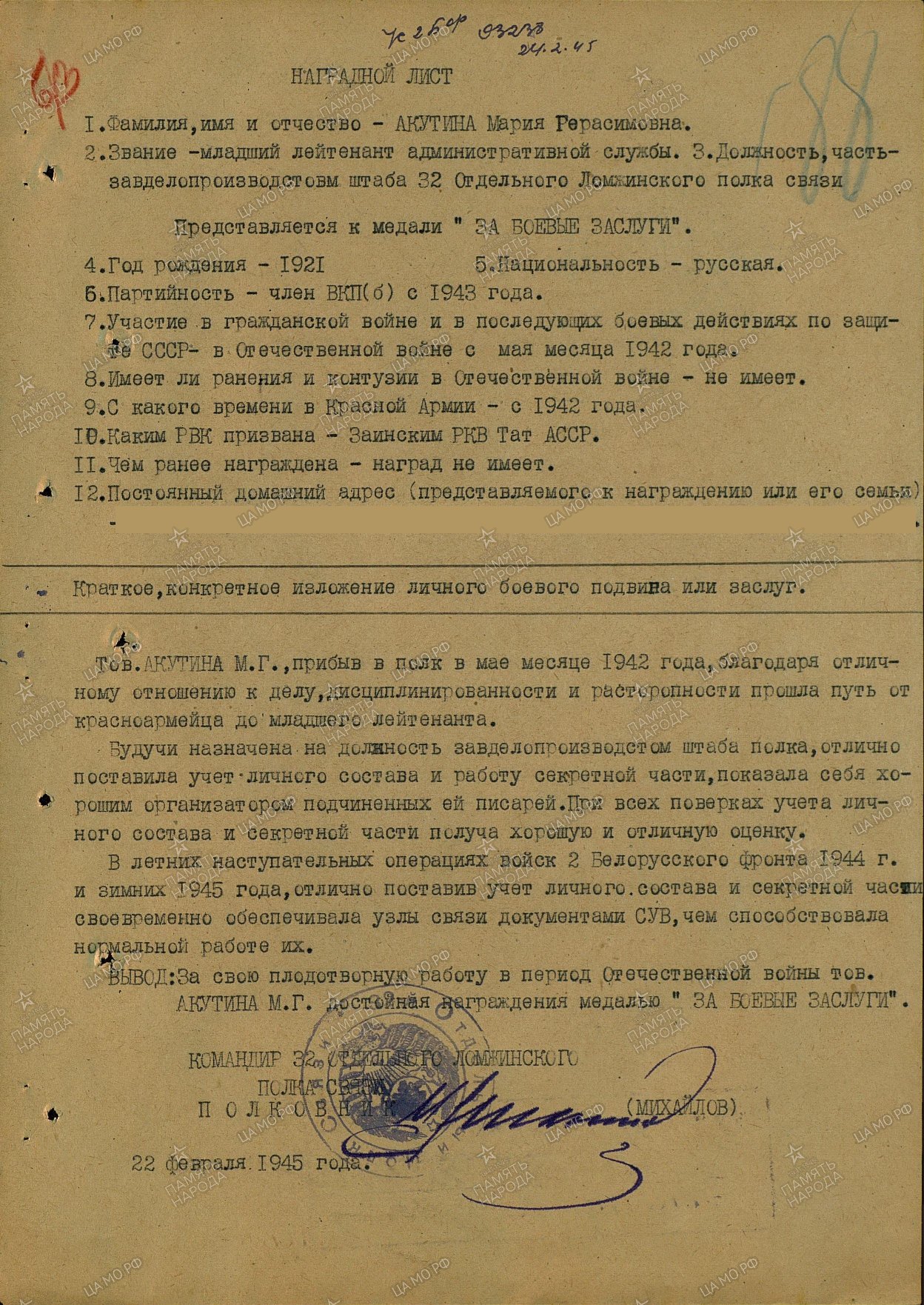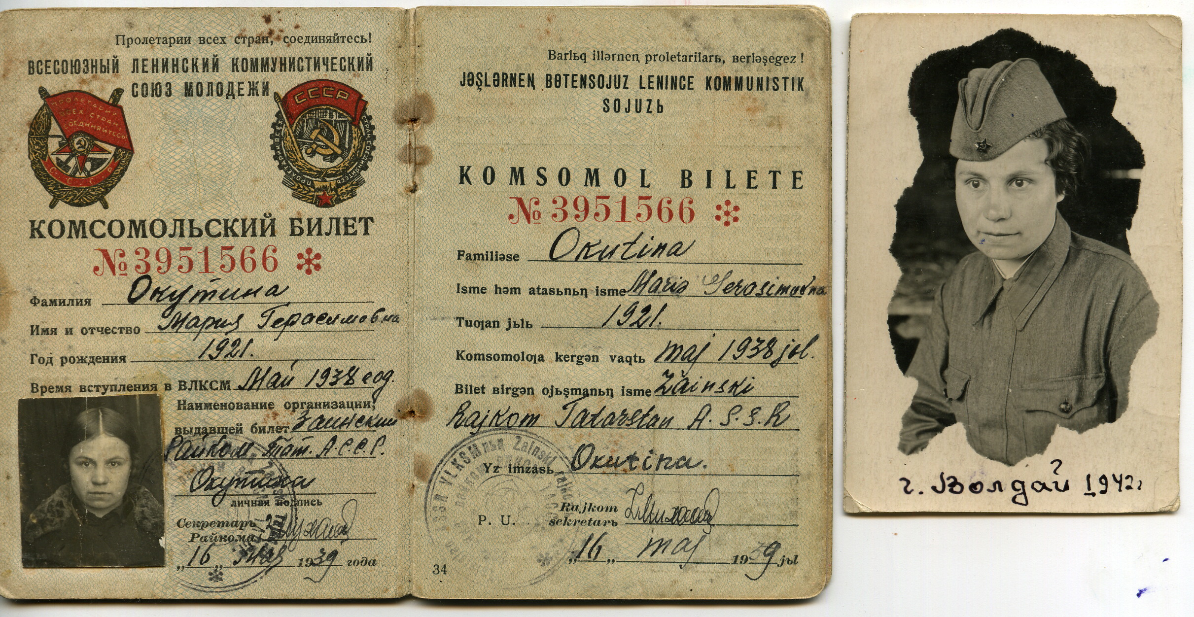 Хрипунова (девичья Окутина) Мария Герасимовна родилась в 1921 году в селе Заинск ТАССР. До войны работала на почте телеграфисткой.