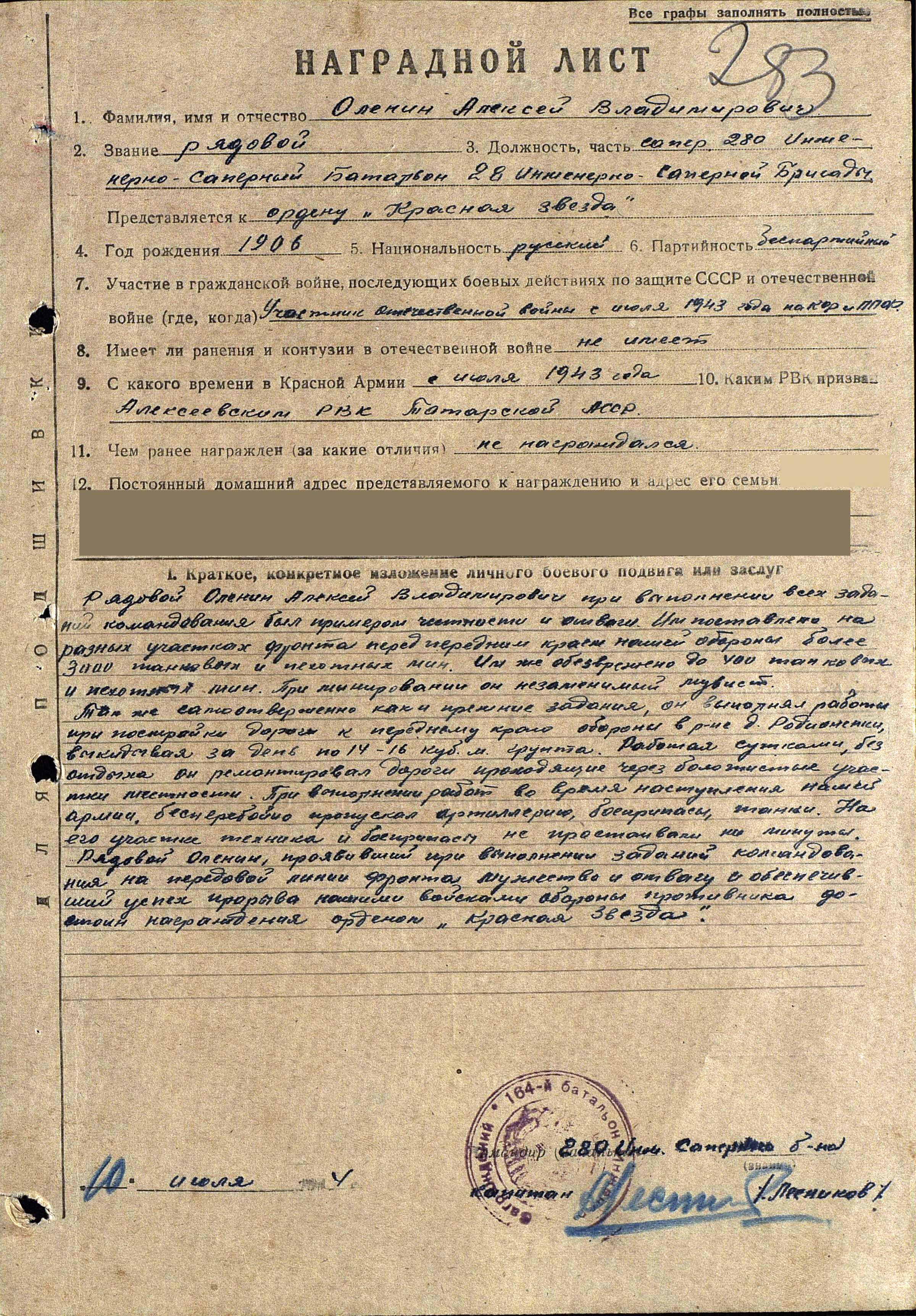 ОЛЕНИН Алексей Владимирович, 1906, с. Селенгуши (сейчас территория Нурлатского р-на РТ). Жил перед войной в с. Караваево. Мобилизован на фронт Алексеевским РВК в 1943 г. Воевал рядовым сапером 280 инженерно-саперного батальона 28 инженерно-саперной бригады на Карельском и 1 Прибалт. фронтах. За безупречную работу на должности сапера награждён орденом Красной Звезды (1944 г.), а также медалью "За победу над Германией". Демобилизован в 1945 г. Работал в Ромодановской МТС трактористом, рабочим совхоза "Большевик". Скончался в 1984 г., похоронен в с. Караваево.