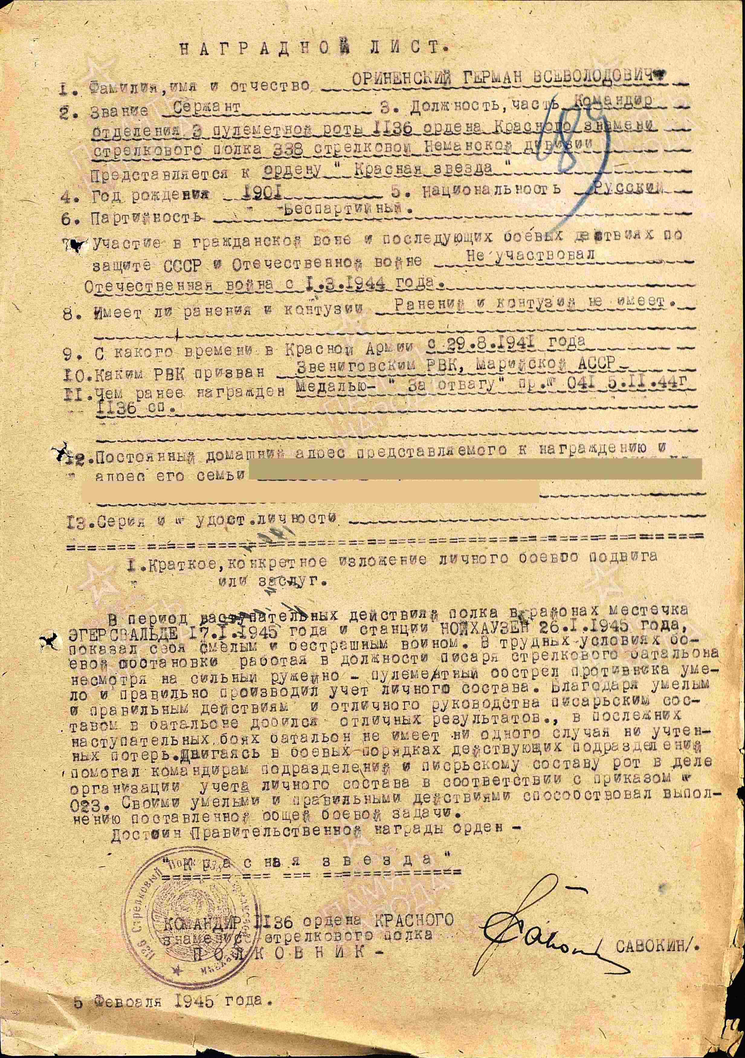ОРИНИНСКИЙ Герман Всеволодович, 1901, с. Сергиевское. Мобилизован Звениговским РВК МарАССР 29 авг. 1941. На фронте с 1 марта 1944. Сержант/ старшина, ком. отделения пулемётной роты/ писарь стрелкового батальона 1136 СП 338 СД 5 А Западного фронта, 39 А 3 Белорусского/ Забайкальского фронта. Награждён медалями «За отвагу», «За боевые заслуги», «50 лет Монгольской Народной армии» (1971), орденом Красной Звезды. Скончался в 1980.
