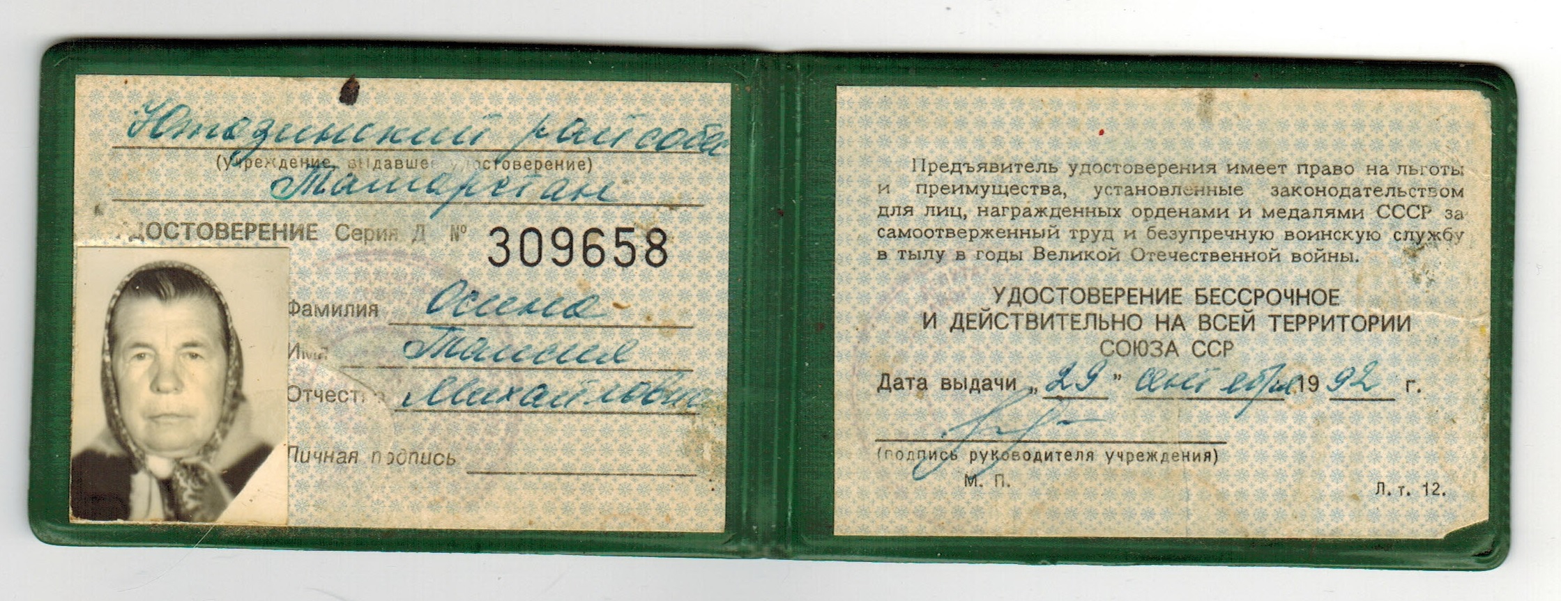 ОСИНА ТАИСИЯ МИХАЙЛОВНА 1925 г.р. За время работы в годы Великой Отечественной войны 1941-1945гг награждена Медалью «За доблестный труд в годы Великой Отечественной войны 1941-1945г.г.».