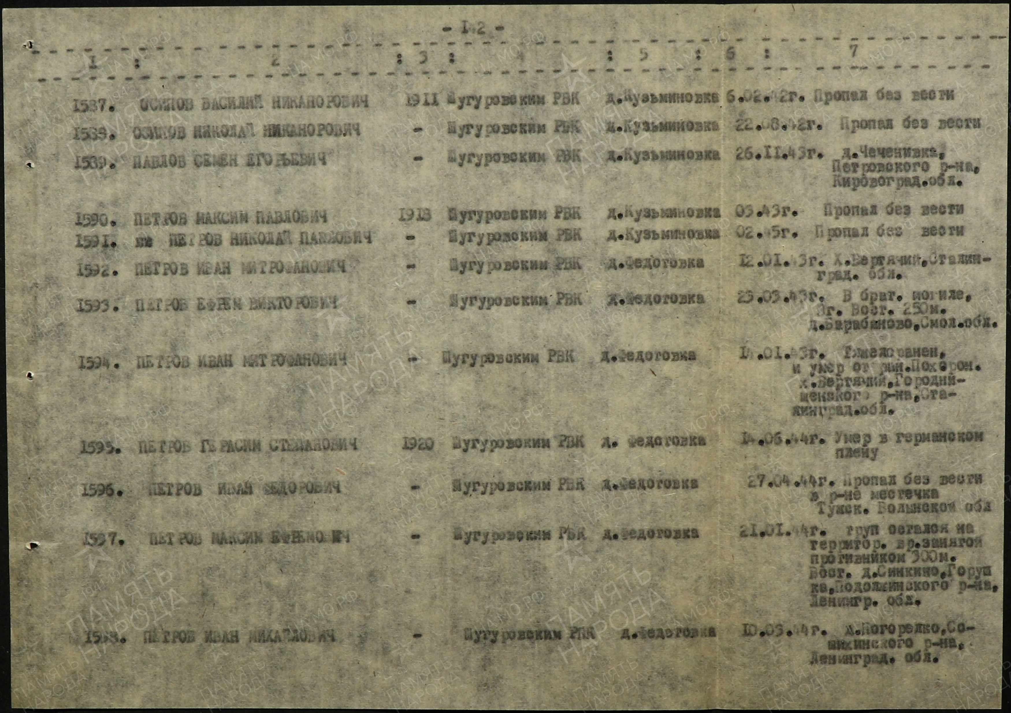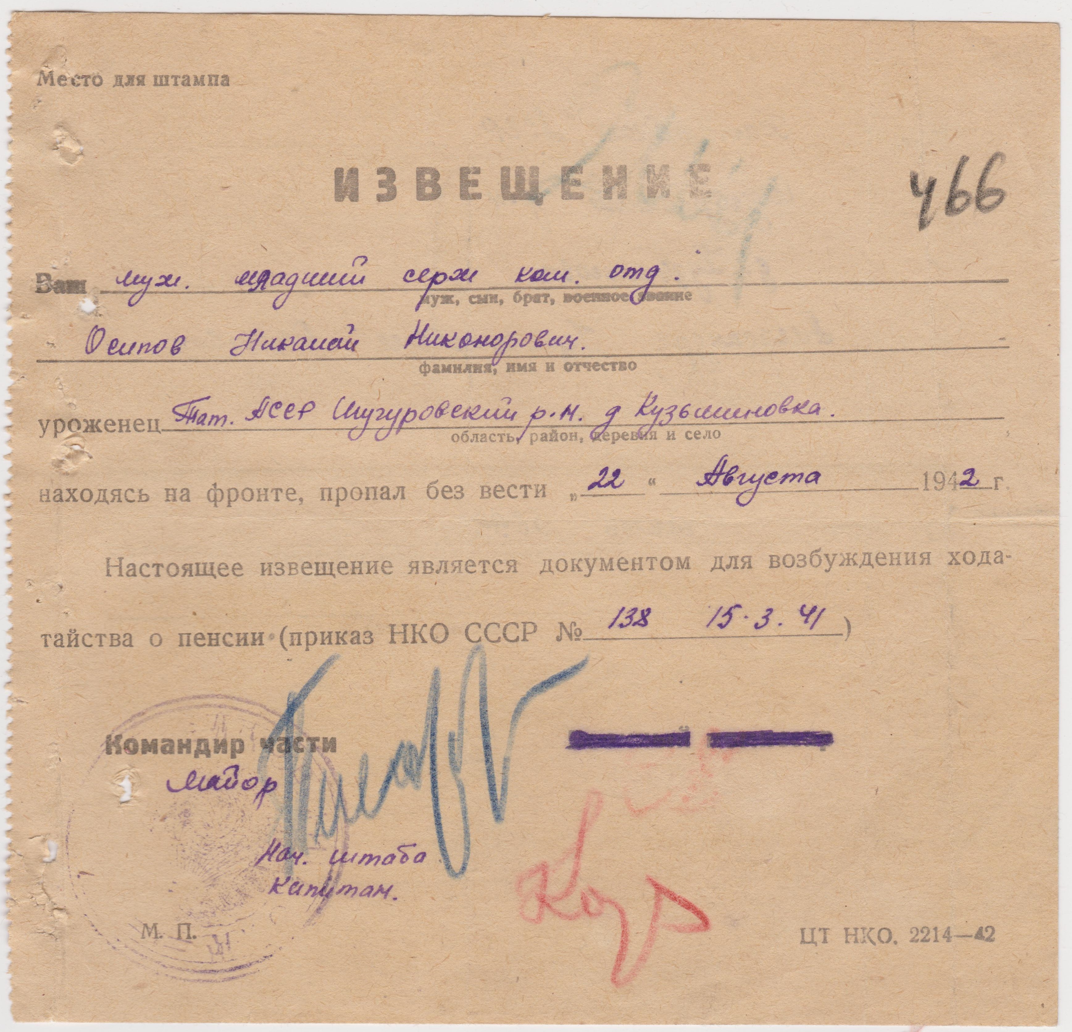 Наш дед Осипов Николай Никонорович родился в декабре 1896 года в деревне Кузьминовка Бугульминского уезда Самарской губернии. Был призван в Действующюю армию в 1915 году. Служил в 23 мортирном артиллерийском дивизионе. Демобилизовался из старой армии в 1918 году,женился.Был крестьянином -хлеборобом. В январе 1919 года в Красной Армии во 2 лёгком артиллерийском дивизионе. Воевал против Колчака в Сибири. Вернулся домой в 1921 году и в связи с голодом подался батрачить в Тверскую губернию к мельнику.С 1923 на руководящих должностях. Перед Великой Отечественной войной работал учётным бухгалтером в Старо-Кувакском лесничестве. Мобилизован на войну с фашистскойи Германией 14 января 1942 года. С Казанского ВПП направлен в учебный лагерь на ст. Суслонгер Марийской АССР в 31 запасную стрелковую бригаду. Далее на Западном фронте . Пропал без вести 22 августа 1942 года . Судя по печати на извещении 1312 стрелковый полк 17 Стрелковой дивизии(часть 56330). Получается где то на стыке Орловской(тогда) и Смоленской области в районе реки Угра. Фотографии в настоящее время нет,когда то была утеряна к большому сожалению.