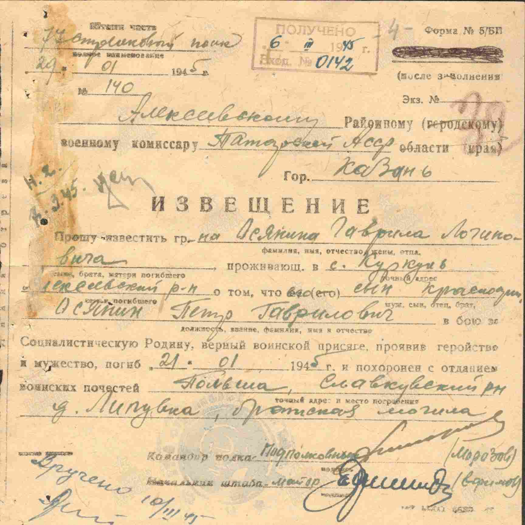 ОСЯНИН Пётр Гаврилович, 1920, с. Куркуль. Призван 15 сент. 1940 Молотовским РВК г. Казань. Красноармеец. На фронте с 1943 воевал в составе 37 гв. СД 65 А ЦентралФ, 375 СД 53 А/ 4 гв. А 2 Украинского фронта, 947 СП 268 СД 67 А 3 Прибалтийского фронта/ 21 А Ленинградского фронта, 77 СП 80 СД 59 А Ленинградского/ 1 Украинского фронта. В боях перенёс три ранения. Проходил лечение в Арм. полевом госпитале 3259, п. Первомайский, Курская обл., ЭГ 927, г. Ленинград. Погиб 21 янв. 1945, д. Липовки, Гарволинский повят, Мазовецкое воеводство, Польша.