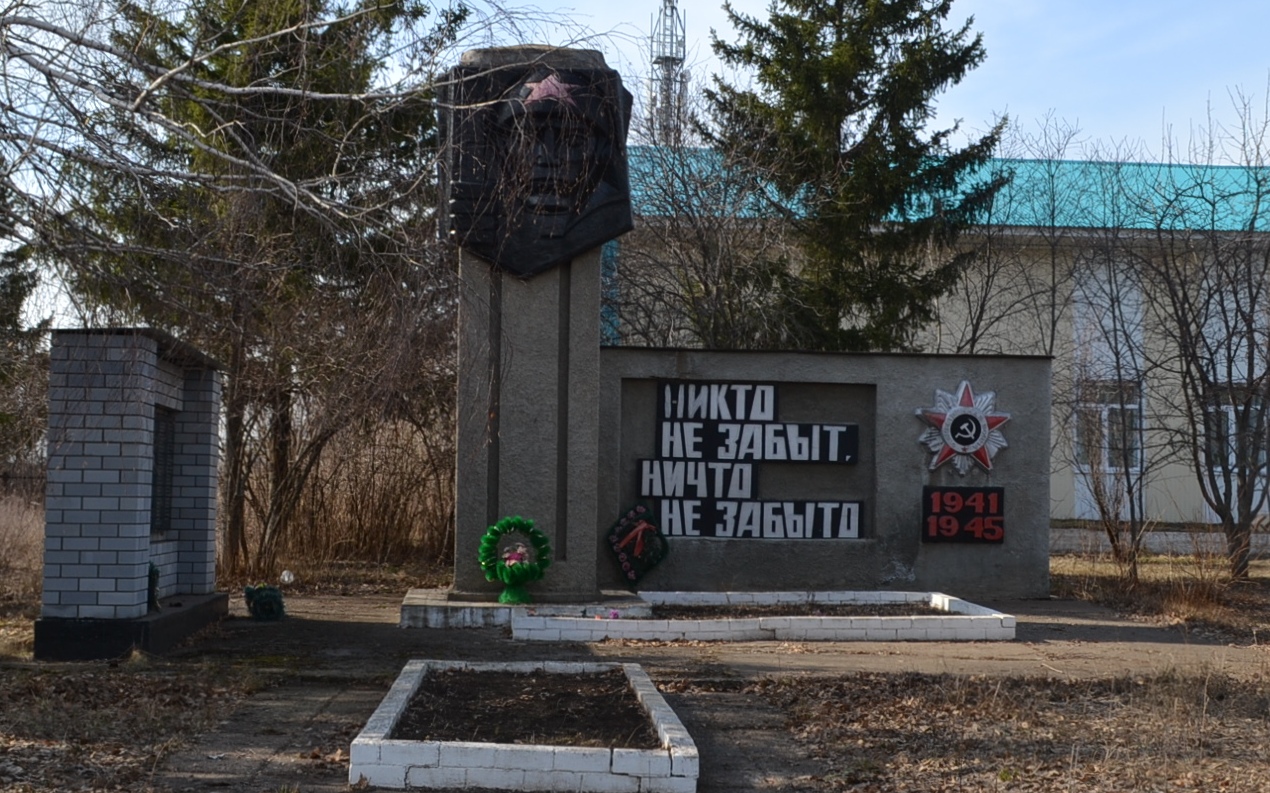 Датирока объекта 1985 год. Мемориальный комплекс состоит из стелы, 2-х мемориальных досок, на одной прикреплен орден, цифры 1941 - 1945 и слова "Никто не забыт, ничто не забыто", на второй прикреплены 6 мраморных табличек (черного цвета) с высеченными именами павших. На верхней части стелы смонтирована глыба темного цвета, с барельефом головы солдата в каске. Плащадка вся заасфальтирована, имеются клумбы с цветами, зеленве насаждения. Материал - железобетонные металлоконструкции, черный мрамор. Расположен на територии сельского Дома культуры. Высота стелы 5 м., мемориальных досок 2 м., длина 3-4 м.