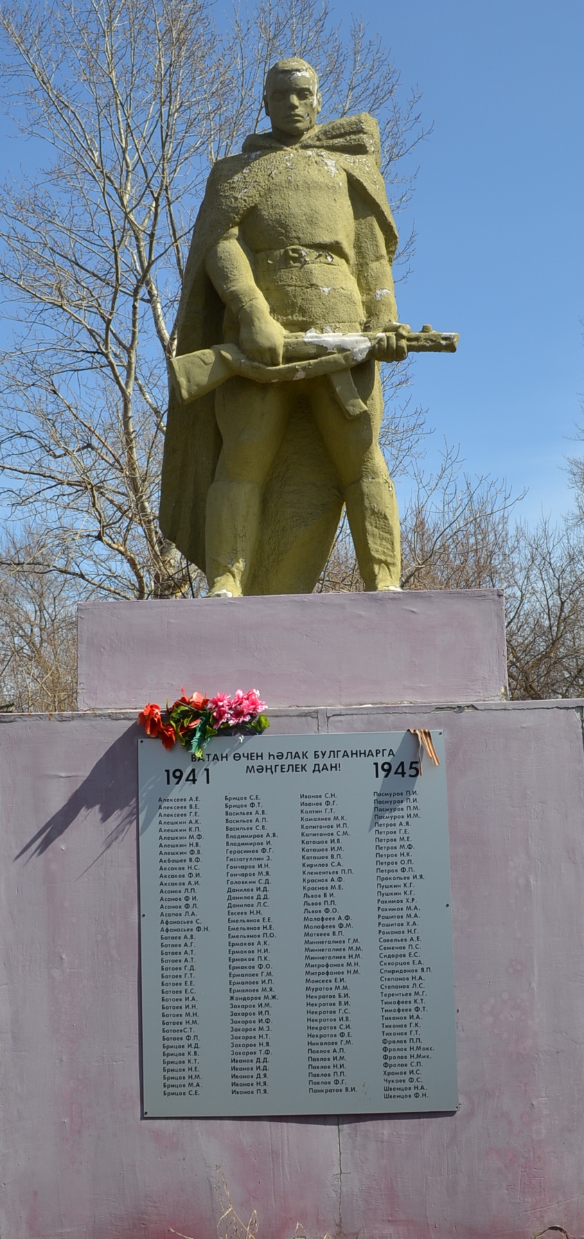 Датировка объекта 1969 год. Скульптура солдата в полный рост стоит с наклоненной головой, в руках винтовка, на постаменте, с прикрепленной табличкой со словами "Ватан очен уэлак булганнарга мэнгелек дан! 1941 - 1945" и фамилиями погибших воинов. Имеется деревянное ограждение и зеленый насаждения. Расположен на центральной улице села. Материал - железнобетонные конструкции. Высота с постаментом 6 м.