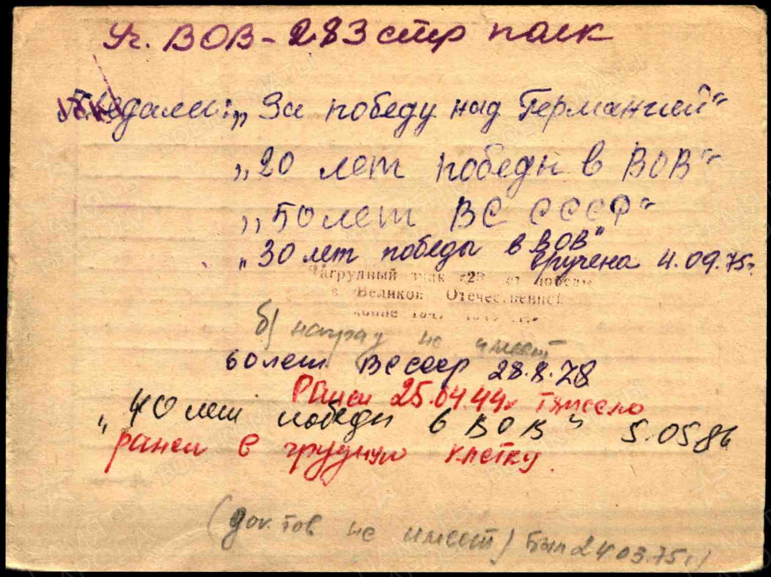 Награжден орденом Красной Звезды; медалями «За отвагу», «За взятие Кенигсберга», «За победу над Германией в Великой Отечественной войне 1941-1945 гг.», юбилейными.