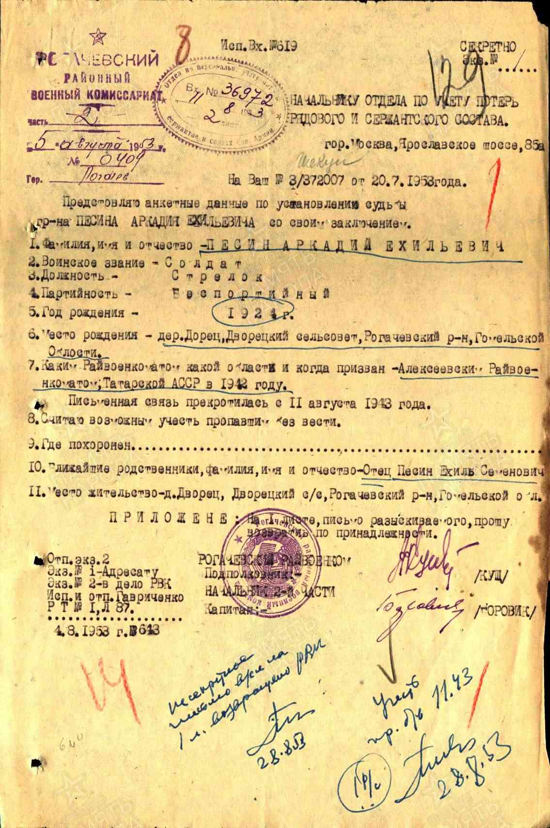 ПЕСИН Аркадий Ехильевич, 1924, д. Дворец, Рогачёвский р-н, Гомельская обл., Белорусская ССР. С 1941 – в эвакуации. Мобилизован в авг. 1942 Алексеевским РВК. Письменная связь с семьёй 11 авг. 1943. Учтён пропавшим без вести.