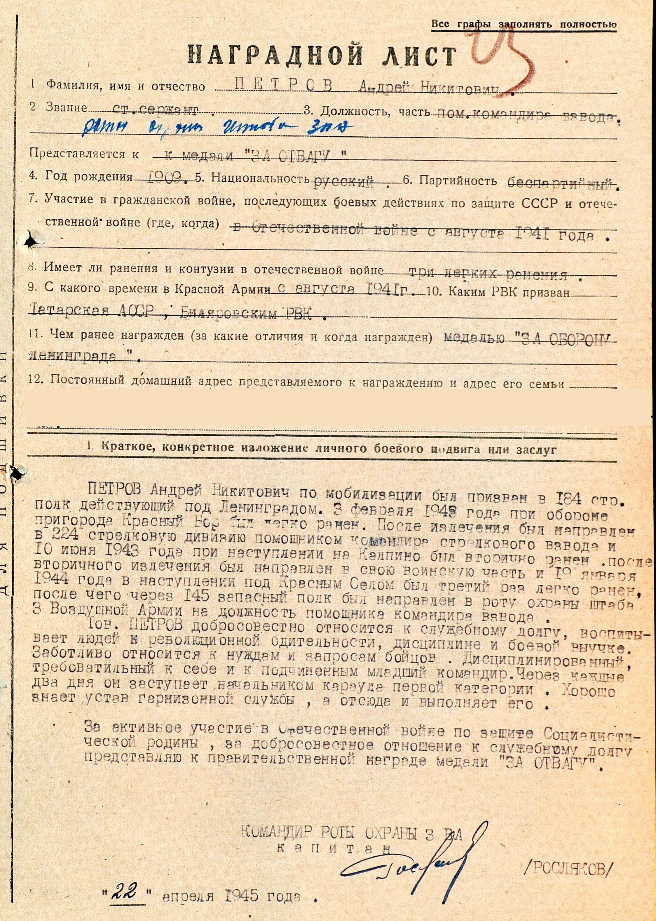 ПЕТРОВ Андрей Никитович (Никифорович), 1909, п. Калиновка /д. Александровка. Мобилизован 2 августа 1941 Билярским РВК. Стрелок 806 СП 235 СД. 24 авг. 1941 был ранен пулей в левую руку под Ленинградом в районе г. Луга. Проходил лечение в ЭГ 3502 (г. Омск). 10 февраля 1942 был признан негодным на 6 месяцев. Мобилизован повторно. 3 февраля 1943 г. при обороне пригорода Красный Бор (Красноборско-Смердынская НО) в составе 184 СП 56 СД был легко ранен. После излечения направлен в 224 СД в качестве пом. ком. взвода, ст. сержант. 10 июня 1943 при наступлении на г. Колпино получил ещё одно лёгкое ранение. По выздоровлении направлен в ту же дивизию. 19 января 1944 при наступлении на Красное Село был снова ранен. После госпиталя через 145 ЗСП направлен в роту охраны штаба 3 ВА на должность зам. ком. взвода, начальника караула первой категории. Награждён медалями "За оборону Ленинграда", "За отвагу" (1945), "За взятие Кёнигсберга". После демобилизации работал председателем колхоза Им. Шмидта. Скончался в 1985, похоронен в д. Александровка.