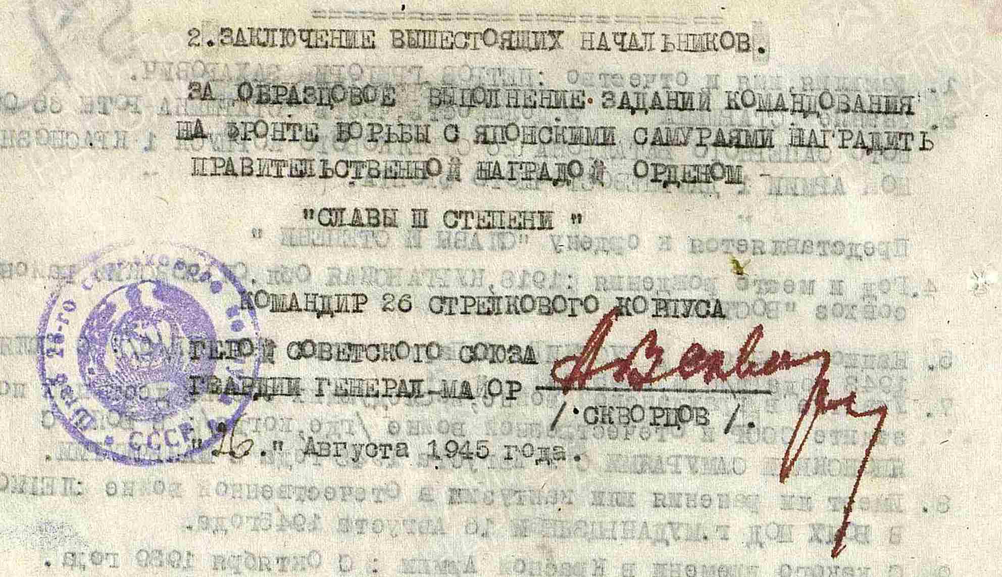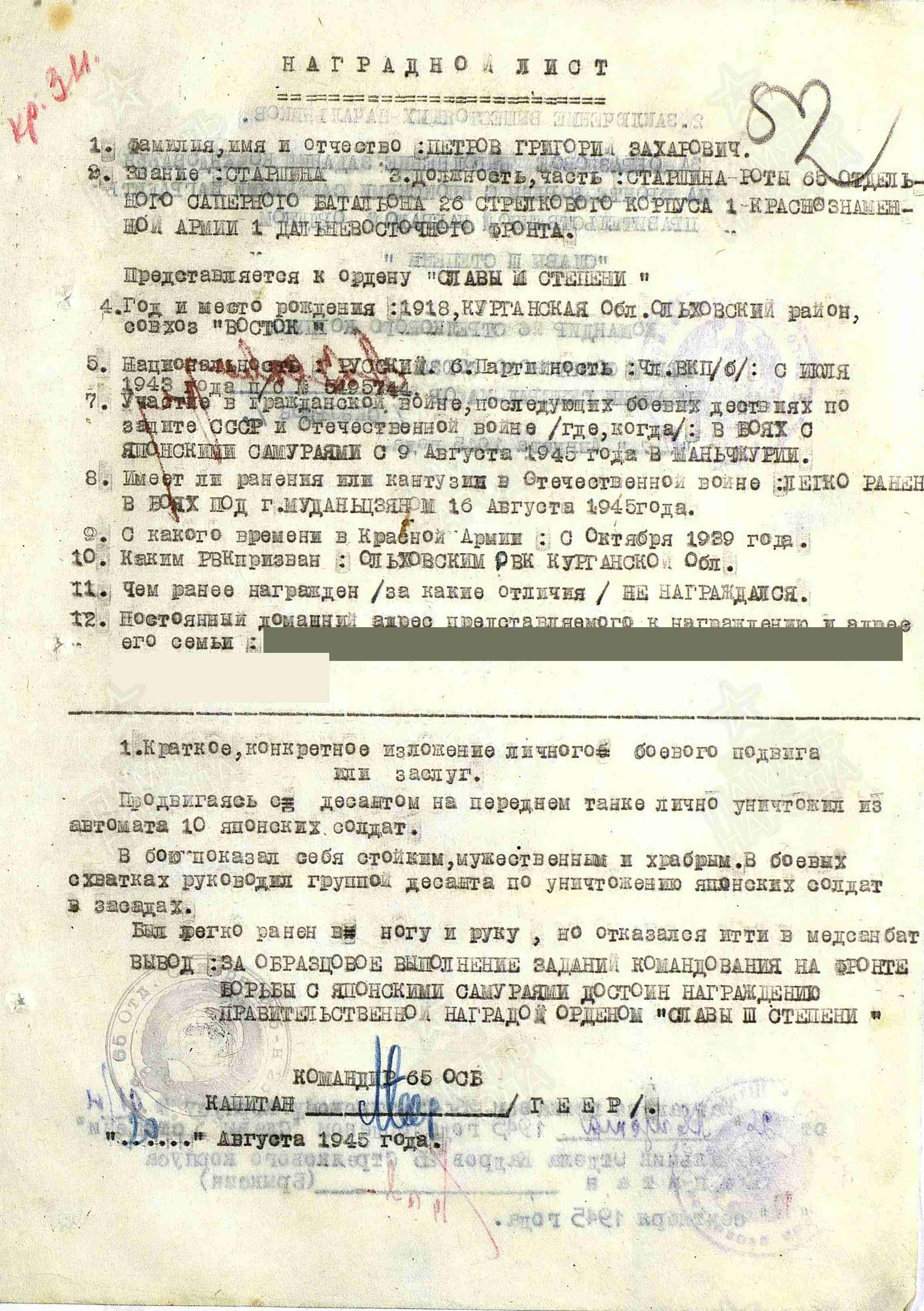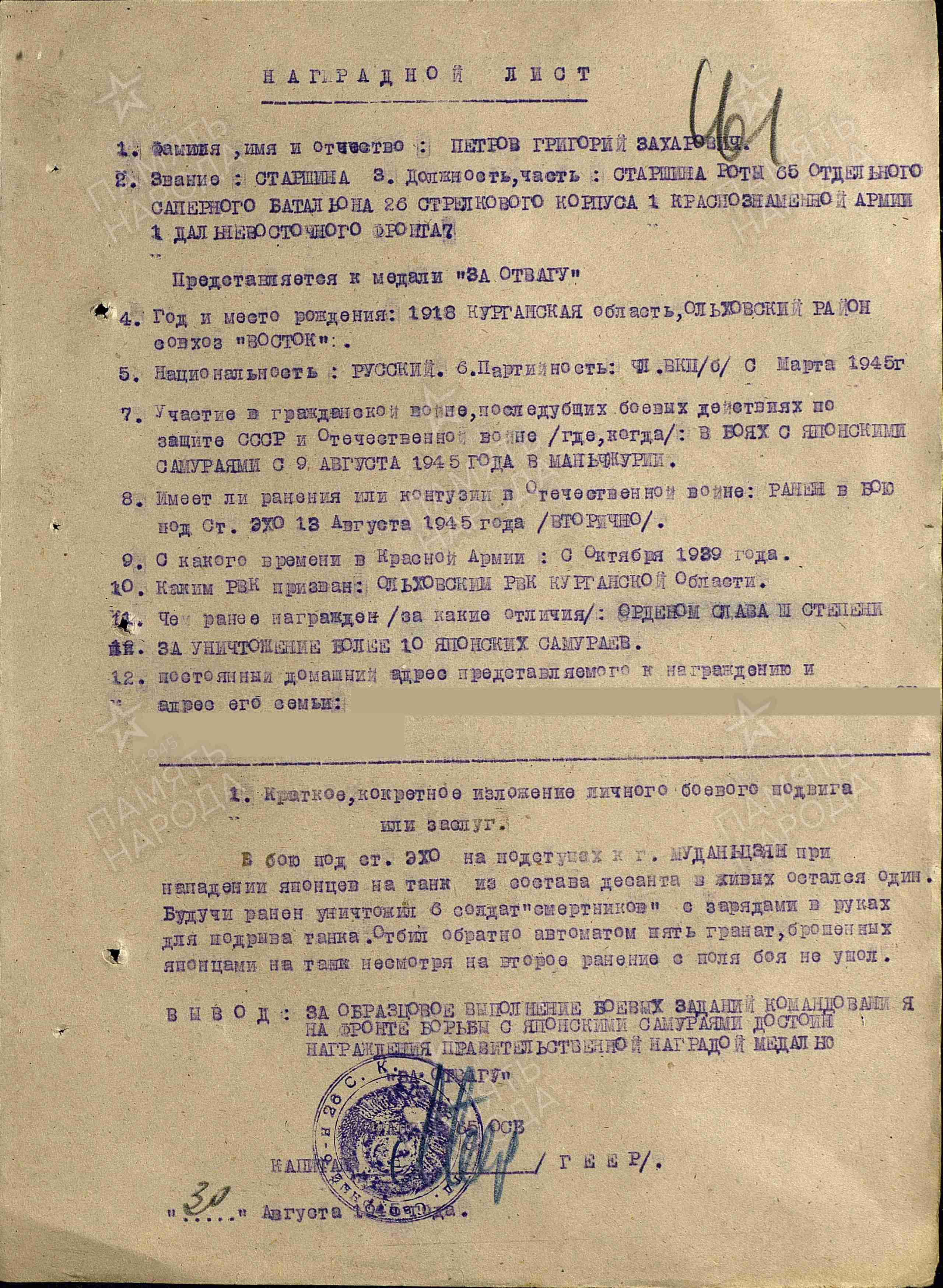 ПЕТРОВ Григорий Захарович, 1918, с. Алексеевское. Жил в совхозе «Восток» Ольховского р-на Курганской обл. Мобилизован 18 сент. 1939 Ольховским РВК. Служил на Дальнем Востоке. В 1945 – старшина роты 65 ОСБ 26 СК 1 А 1 ДВФ. В августе 1945, продвигаясь с десантом на головном танке, лично уничтожил из автомата 10 японских солдат. Руководил группой автоматчиков в сватках с «самураями», нападавших из засад. Был легко ранен в ногу и руку, но отказался убыть в медсанбат. 13 авг. 1945, в бою за ст. Эхо на подступах к г. Муданьцзян в Маньчжурии, при нападении японцев на танк, из состава десанта остался один. Будучи раненым уничтожил шесть солдат-«смертников» с зарядами для подрыва танка. Отбил пять гранат, брошенных японцами в танк. Несмотря на повторное ранение с поля боя не ушёл. Был представлен к ордену Красного Знамени. Награждён медалями «За отвагу», «За победу над Японией», орденами Славы 3 ст., Отечественной войны 1 ст. (1985).