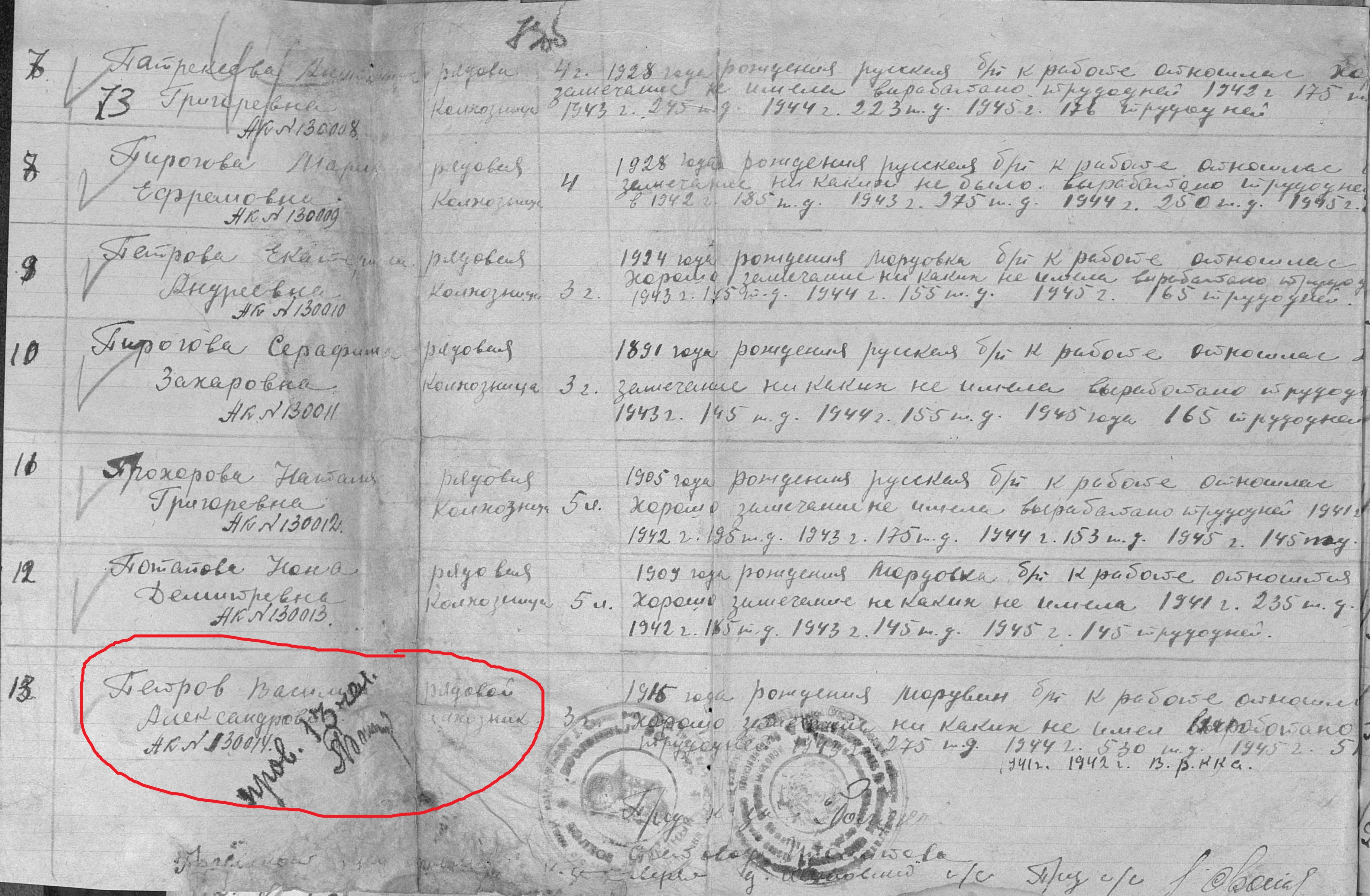 Петров Василий Александрович родился в 1915 году. Место жительства: д.Дальняя Ивановка Ново-Шешминский район ТАССР (ныне Альметьевский район РТ). В годы Великой Отечественной войны работал в колхозе "Красная Долина" рядовым колхозником. Награжден медалью "За доблестный труд в Великой Отечественной войне 1941–1945 гг." (Акт от 28 апреля 1947 г, фонд 3610, опись 2, дело № 325, лист 73, № 130014).