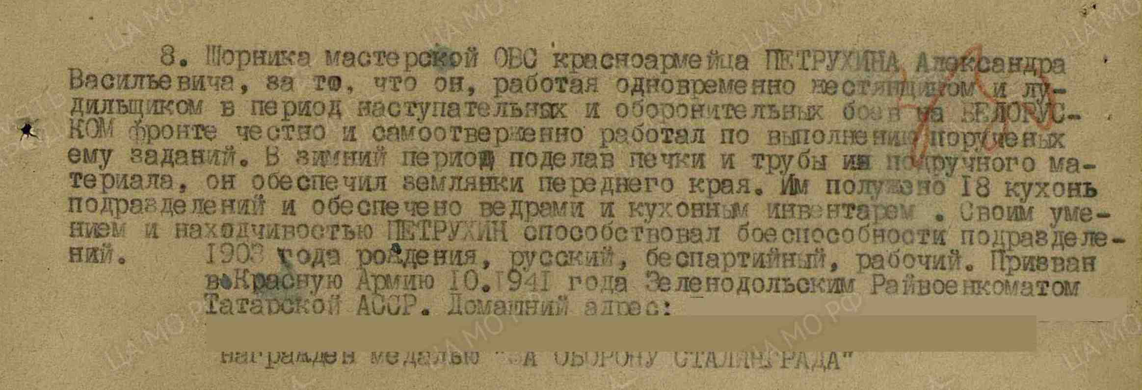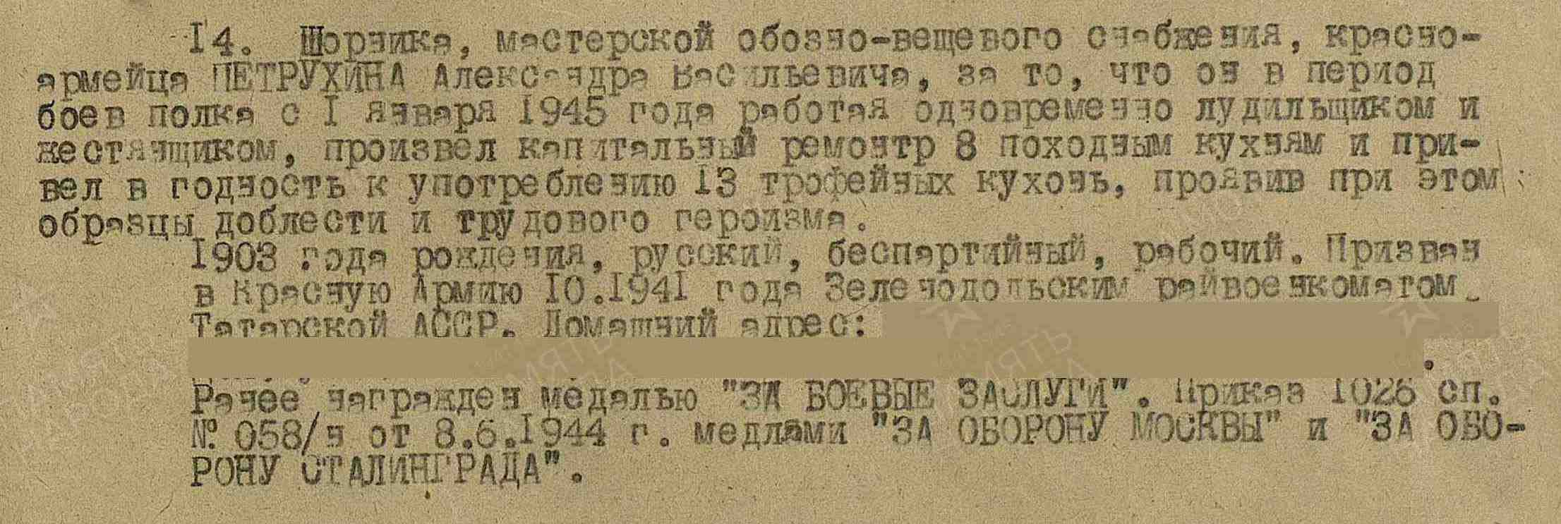 ПЕТРУХИН Александр Васильевич, 1903, с. Лебедино. Мобилизован 6 сент./ 21 окт. 1941 Зеленодольским РВК. Воевал на Западном, Донском, Брянском, Белорусском, 2 и 1 Белорусском фронте в составе 1 УдА/ 20 А/ 5 А/ 1 гв. А/ 24 А/ 65 А/ 11 А/ 63 А/ 47 А. Участник битвы за Москву, Сталинград, на Курской дуге, освобождения Белоруссии, Украины, Польши, г. Варшава, штурма предместий Берлина. Красноармеец, шорник, жестянщик, лудильщик, повозочный обозно-вещевой службы 55 отд. Сбр/ 1026 СП 260 СД. Награждён медалями «За оборону Сталинграда», «За оборону Москвы», двумя медалями «За боевые заслуги». Демобилизован 25 июля 1945.