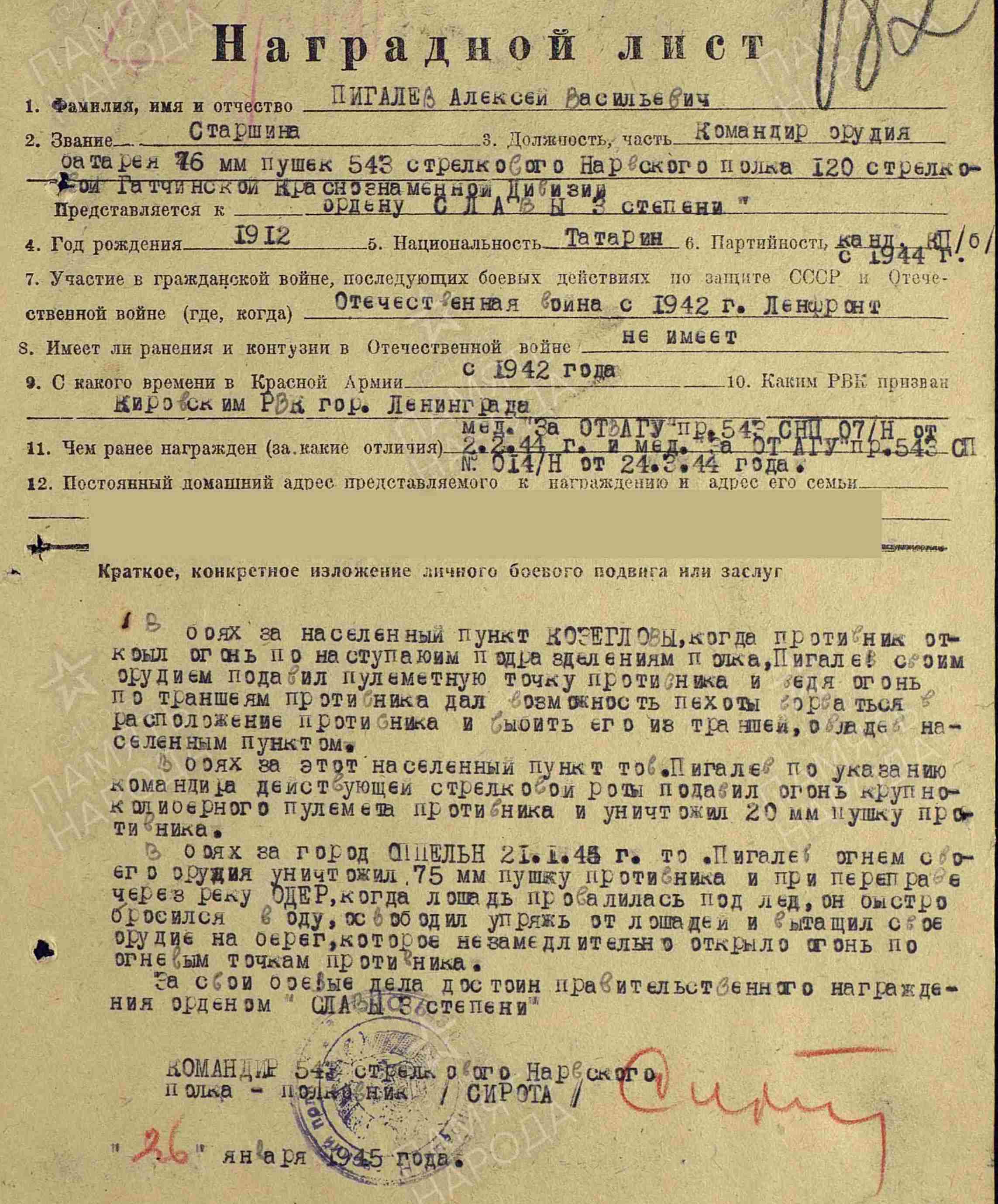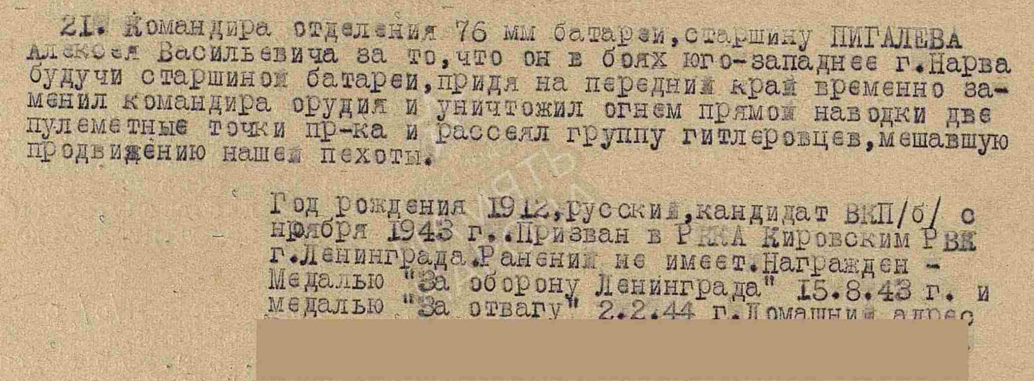 ПИГАЛЁВ Алексей Васильевич, 1912, д. Пановка. Мобилизован Кировским РВК г. Ленинград в 1942. Красноармеец. Ошибочно учтён погибшим (умершим от ран) и похороненным в с. Войбокало, Лен. обл., 20 фев. 1942. Старшина, ком. отделения, ком. орудия, старшина 76 мм батареи 543 СП 120 СД в составе 67 А/ 2 УдА/ 59 А/ 8 А Ленинградского фронта, 21 А 1 Украинского фронта. Канд. ВКП(б). В боях юго-западнее г. Нарва заменил ком. орудия, огнём с прямой наводки разбил две пулемётные точки противника, рассеял группу гитлеровцев. В бою за н.п. Козегловы подавил огневую точку врага, уничтожил крупнокалиберный пулемёт и 20 мм пушку. В боях за г. Оппельн (Ополе), 21 янв. 1945, огнём орудия уничтожил 75 мм пушку. При переправе через р. Одер, когда лошадь провалилась под лёд, бросился в воду, освободил упряжь от лошадей, вытащил орудие на берег и незамедлительно открыл огонь по врагу. Награждён медалью «За оборону Ленинграда», двумя медалями «За отвагу», орденом Славы 3 ст.