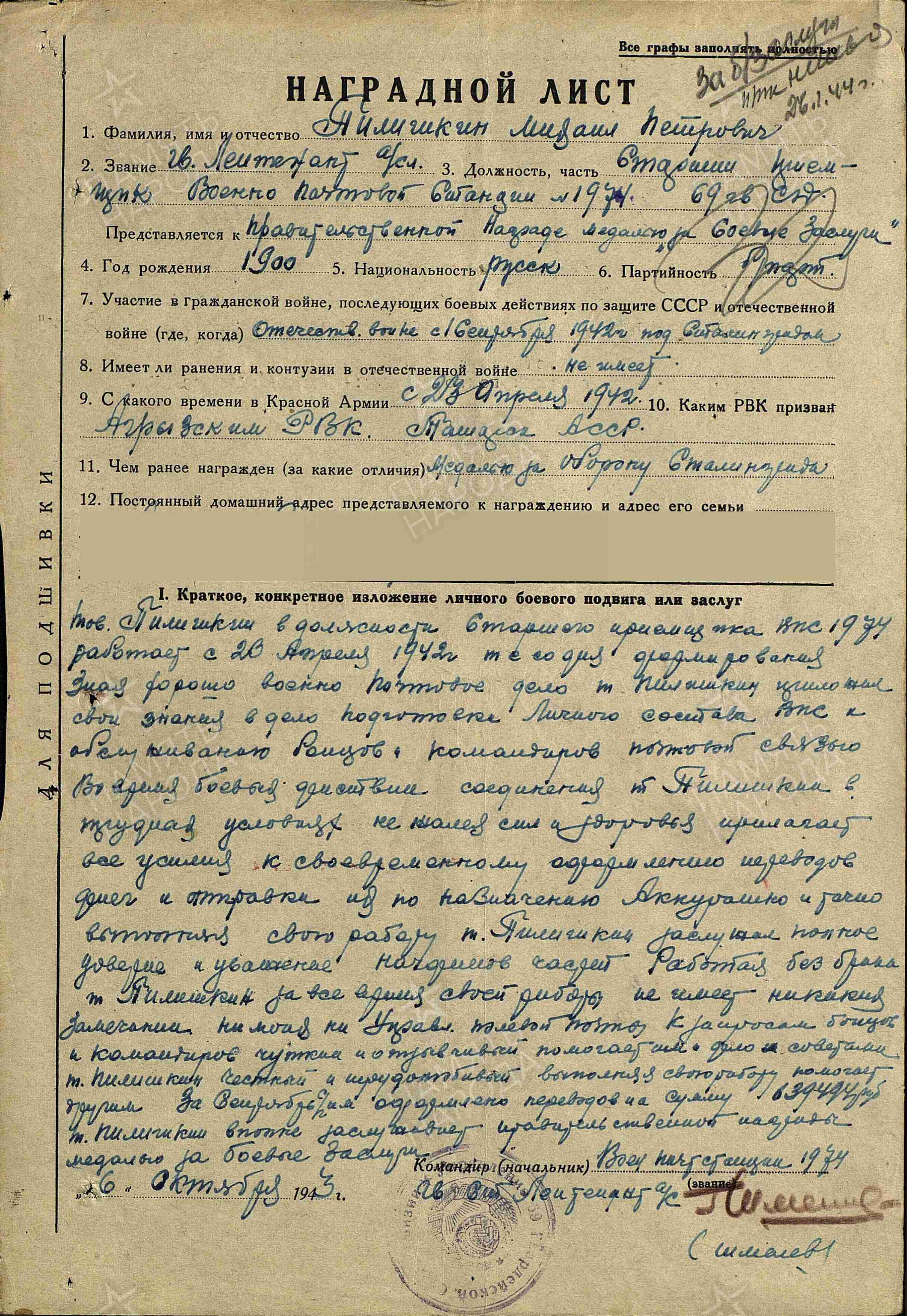ПИЛИШКИН Михаил Петрович, 1900, с. Алексеевское. С 1922 проходил срочную службу в РККА. Мобилизован 25 марта/ 23 апр. 1942 Агрызским РВК. Лейтенант/ гв. лейтенант, ст. приёмщик полевой почтовой станции № 1974, 120 СД 66 А/ 24 А/ 21 А Сталинградского/ Донского фронта, 4 гв. А Воронежского, 2 и 3 Украинского фронта. Награждён медалями «За оборону Сталинграда», «За боевые заслуги», «За взятие Будапешта», «За взятие Вены». Уволен в запас 30 нояб. 1945.