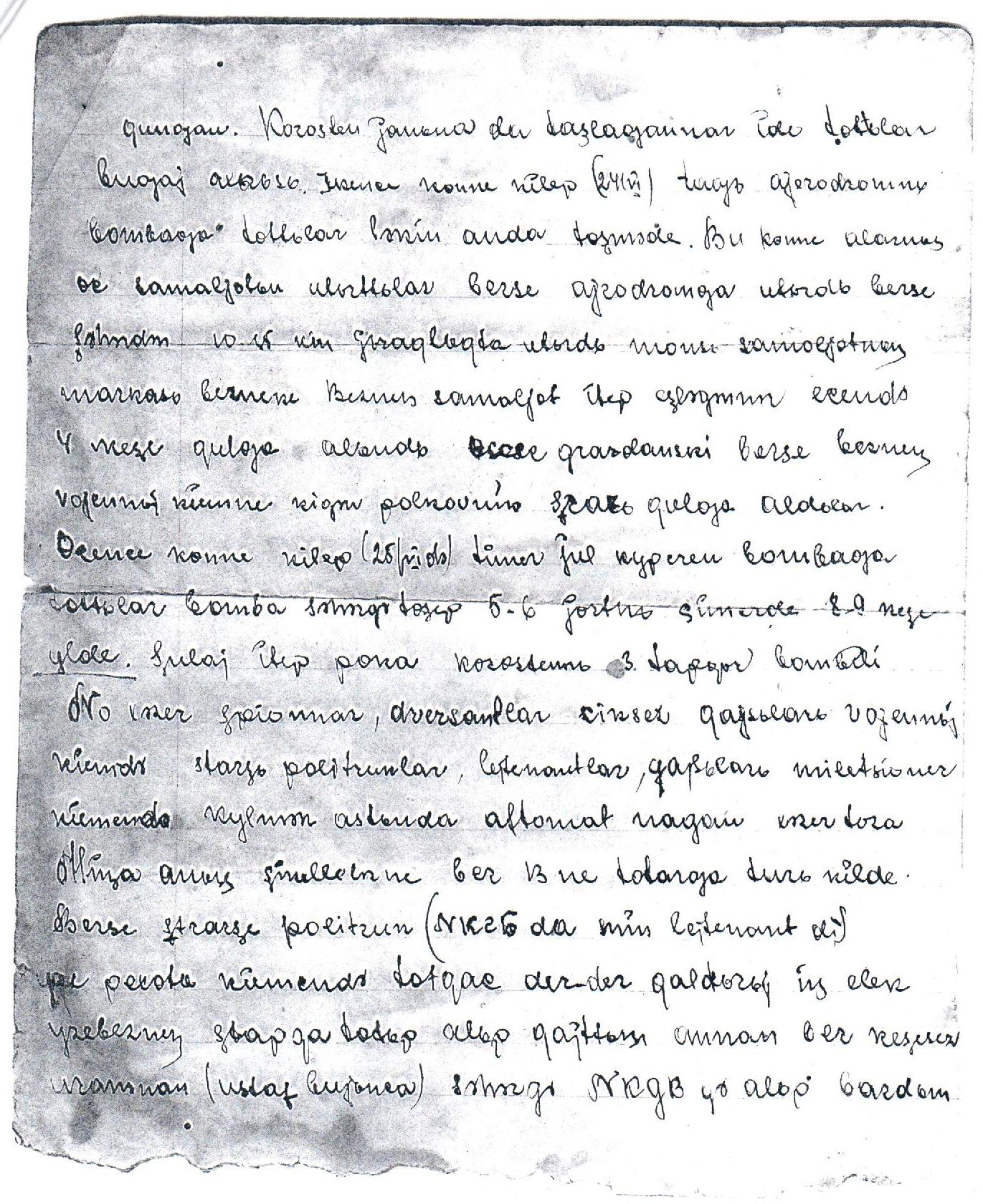 Письмо с фронта от Ахметова Фаиза Нурмухаметовича, уроженца Кукморского района с.Каркаусь супруге Ахметовой Хаят. Ахметов Фаяз Нурмухаметович - 1921 года рождения, дер.Каркаусь, мобилизован Кукморским РВК, красноармеец. Перевод с латинского языка: "Хәят миннән сиңа һәм Камилләргә бик күп сәлам. Мин синең 22 июньдә язган хатыңны 30 июньдә алып укыдым. Нәрсә язгансың бар да аңлашылды. Без 21 июнь көнне көндез 12 сәгатькә кадәр кино карап йокыга яттык. Бәхет булмады. Иртәнге сәгать 4 җитүгә "Коралга" дип кычкырдылар. Шуннан башланды. Бу көнне иртән фашист самолетлары 6 сәгатьтә иртән килеп шәһәр өстендә очып-очып йорделәр. Бер җирдә бер ут юк. Төне буе Коростень белән көнбатыш якта 2 точка ут белән морзе әлифбасы бирештеләр. Иртәгесен иртән сәгать 6 да немец самолетлары килеп Корстень өстендә оча башладылар. Күп тә очмадылар. Базга чиләк белән бәрәңге койгандай шәһәр өстенә утызлап бомба ташладылар..."