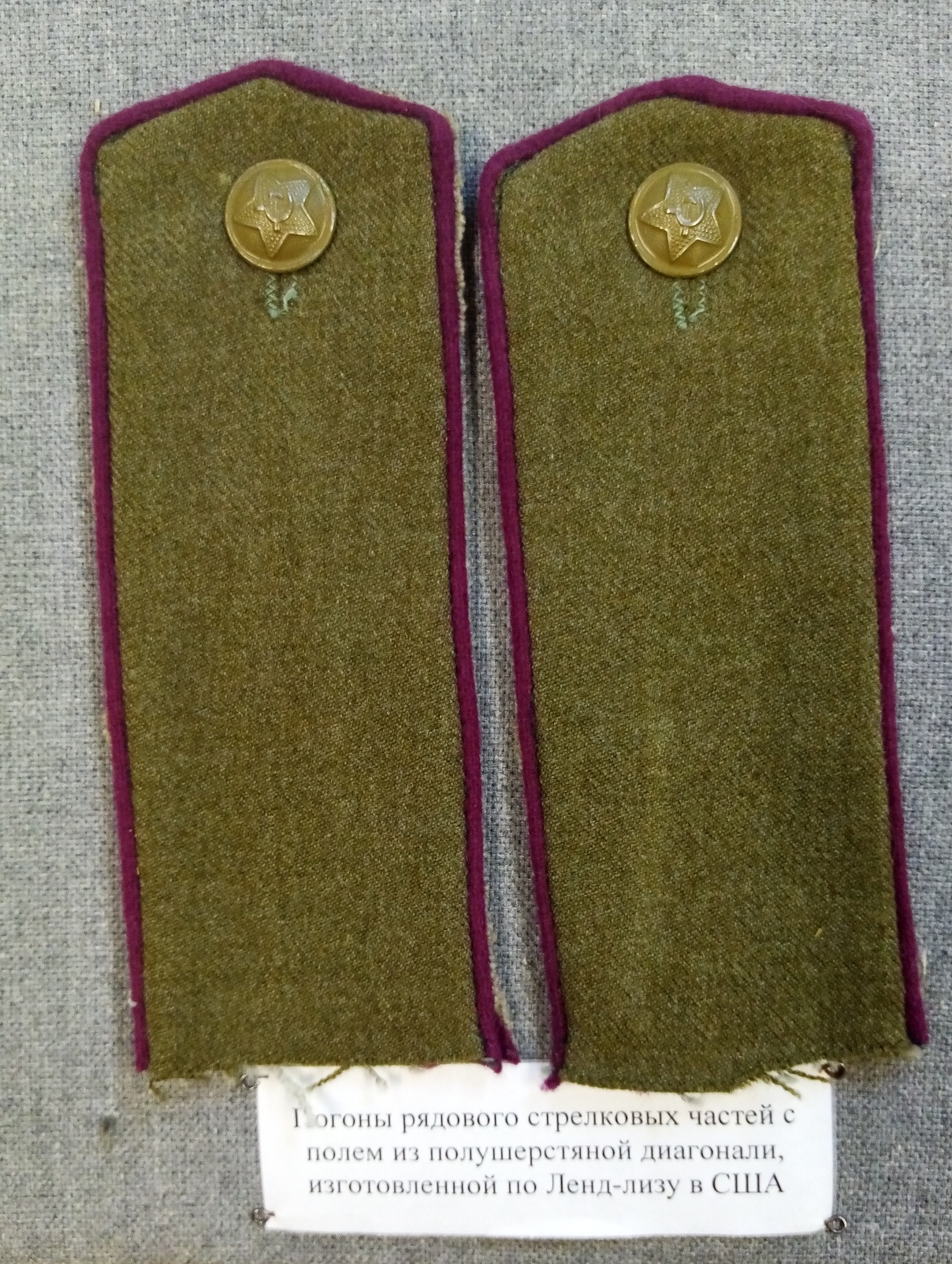 Погоны полевые вшивные (вшивались в разрез стыка плеча и рукава гимнастёрки или шинели) рядового стрелковых частей РККА обр. 1943 с полем из полушерстяной диагонали, изготовленной в США для поставок в СССР по ленд-лизу. Для крепления использованы уставные погонные полевые пуговицы диам. 18 мм.
