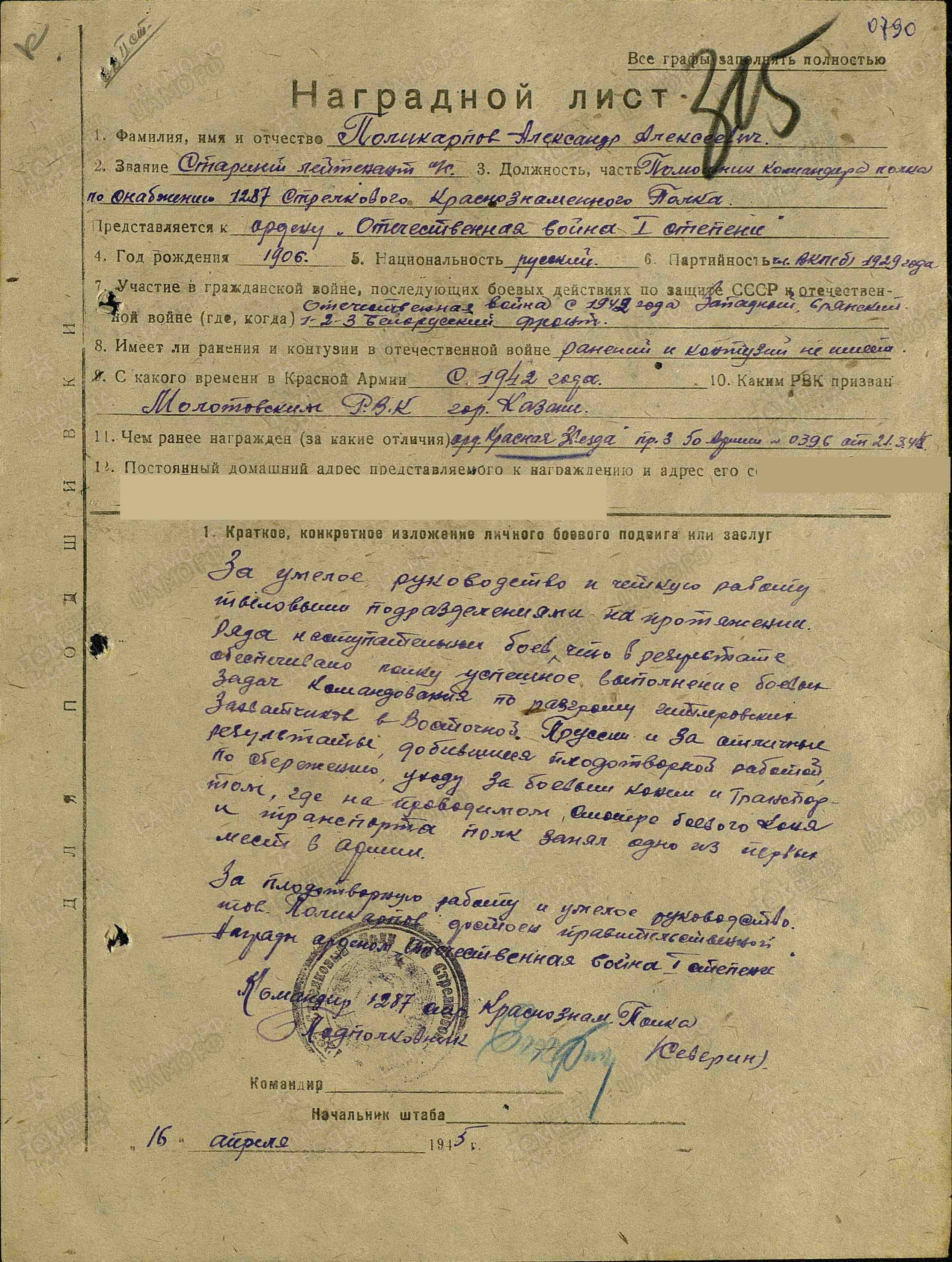 ПОЛИКАРПОВ Александр Алексеевич, 1906, с. Левашево. В 1937 г. работал председателем Пестречинского райисполкома. 30 ноября 1937 г. был арестован как "участник правотроцкистской повстанческой организации и вредитель". Предъявлено обвинение по ст. 58-2, 58-7, 58-11. НКВД ТАССР 25 фев. 1940 г. дело прекращено за недостаточностью улик. В 1942 г. был мобилизован Молотовским РВК г. Казань. Лейтенант интендантской службы, позднее ст. лейтенант административной службы, помощник по снабжению командира 1287 стр. полка 110 СД 69 СК. На фронте с января 1943 г. Воевал на Западном, Брянском, 1, 2, 3 Белорусском фронтах, участвовал в форсировании Днепра и в боях в Восточной Пруссии. Награждён орденом Красной Звезды, медалью "За боевые заслуги".
