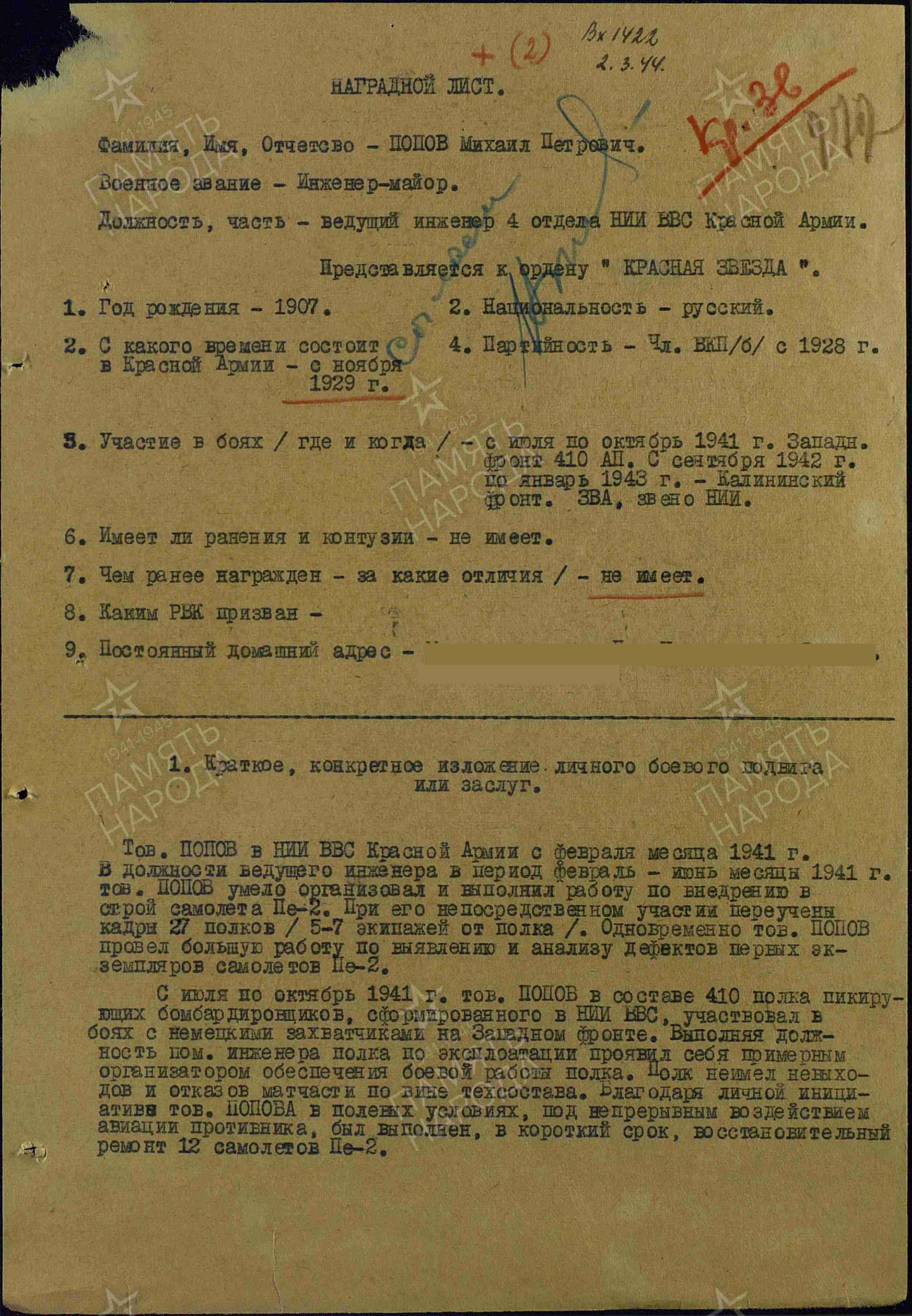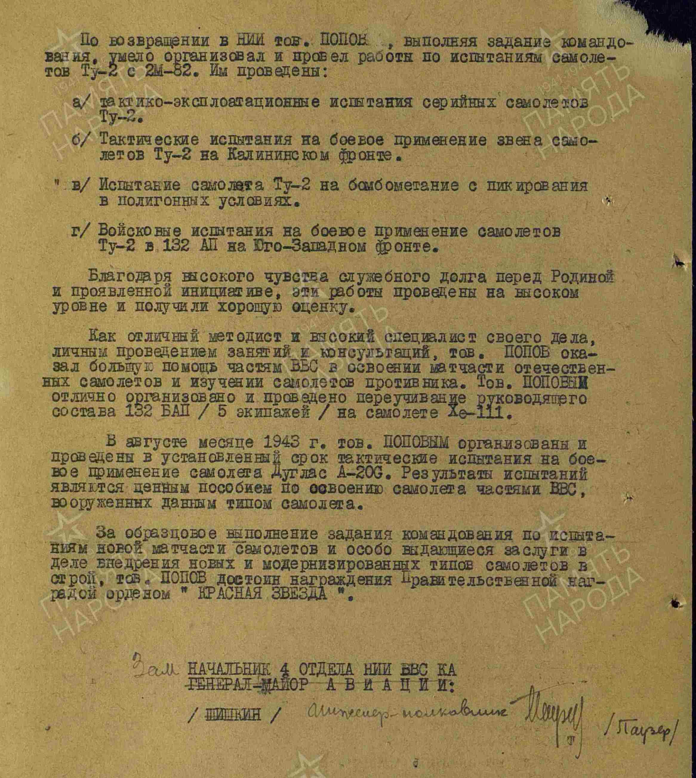 ПОПОВ Михаил Петрович, 1907, с. Билярск. Член ВКП(б) с 1928. Призван в Красную Армию с 6 нояб. 1929 из г. Новосибирск. С 1932 служил в ВВС, прошёл инженерную подготовку. Инженер-майор, с янв. 1941 – ведущий инженер 4 отдела Управления испытаний самолётов ГК НИИ ВВС КА. С июля по окт. 1941 находился в действующем 410 АвП пикирующих бомбардировщиков на Западном фронте, пом. инженера полка по эксплуатации. С сент. 1942 по янв.1943 – в составе 3 ВА Калининского фронта, испытательное звено НИИ ВВС. В дальнейшим находился в составе 132 БАвП на Юго-Западном, 3 Белорусском, 1 Прибалтийском фронте, инженер-испытатель. Внёс значительный вклад во внедрение в серийное производство, устранение дефектов и ввод в боевую эксплуатацию самолётов Пе-2 и Ту-2. Награждён медалью «За боевые заслуги» (1944), двумя орденами Красной Звезды (1944, 1947), двумя орденами Отечественной войны 2 ст. (1945, 1985), орденом Красного Знамени (1952). Вышел в отставку 22 апр. 1954 в звании «инженер-полковник».