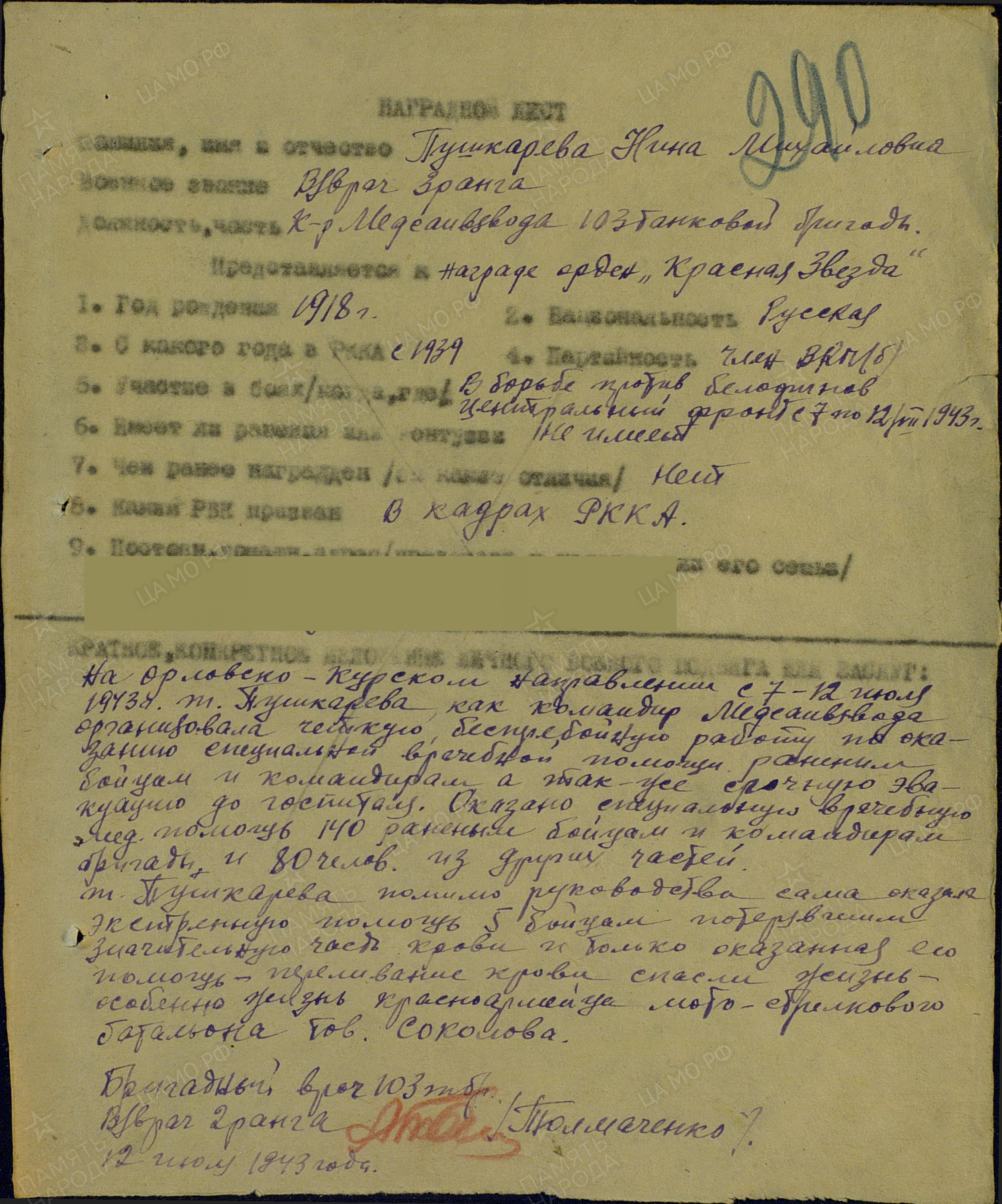 ПУШКАРЁВА Нина Михайловна, 1918, с. Билярск. Мобилизована 1 авг. 1939 Казанским ГВК. Военврач 3 ранга. Участница Советско-финской войны. Участница боёв на Центральном фронте. Капитан медицинской службы, ком. мед. санитарного взвода 103 ТБр 2 ТА. Член ВКП(б). «На Орловско-Курском направлении, 7-12 июля 1943, как ком. медсанвзвода организовала чёткую бесперебойную работу по оказанию спец. врачебной помощи раненым бойцам и командирам, а также эвакуацию в госпиталь. Оказана помощь 140 раненым бойцам и командирам бригады и 80 бойцам других частей. Лично оказала экстренную помощь пяти бойцам, потерявшим много крови. Переливанием крови была спасена их жизнь». С сент. 1943 по май 1945 – в составе ЭГ 1307 на разных фронтах с дислокацией в г. Курск, г. Проскуров (УкрССР), г. Жешув, г. Бранув, г. Шпротава, г. Жагань (Польша). Уволена в запас 11 апр. 1946. Награждена орденами Красной Звезды (1943), Отечественной войны 2 ст. (1985).