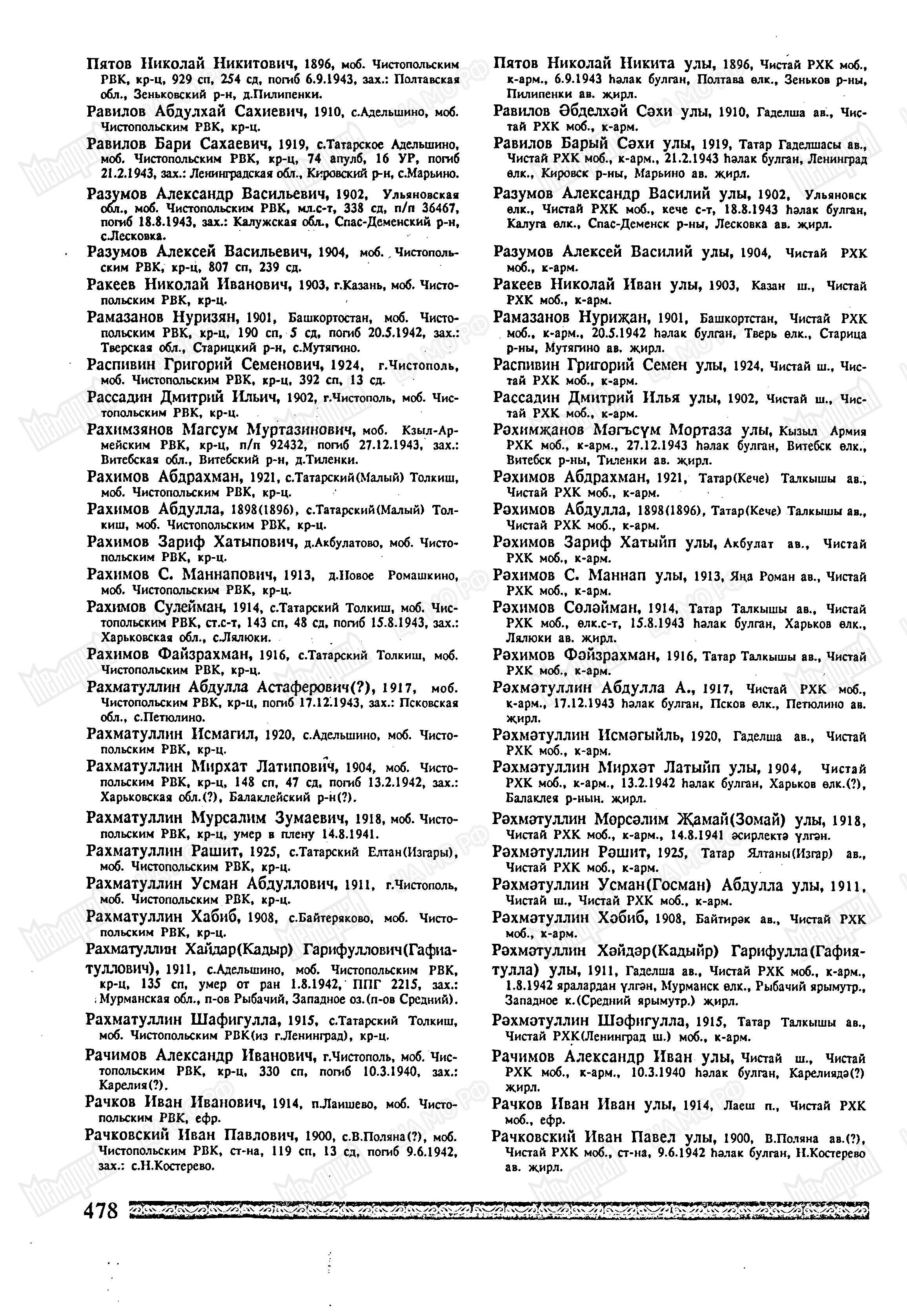 Родился в 1918 г. в д. татарский Ялтань Чистопольского уезда. Пленен 14 августа 1941 г. Рядовой Рахматуллин Мурзалим Зумаевич погиб в плену 8 июня 1942 г. Первичное место захоронения: Финляндия.