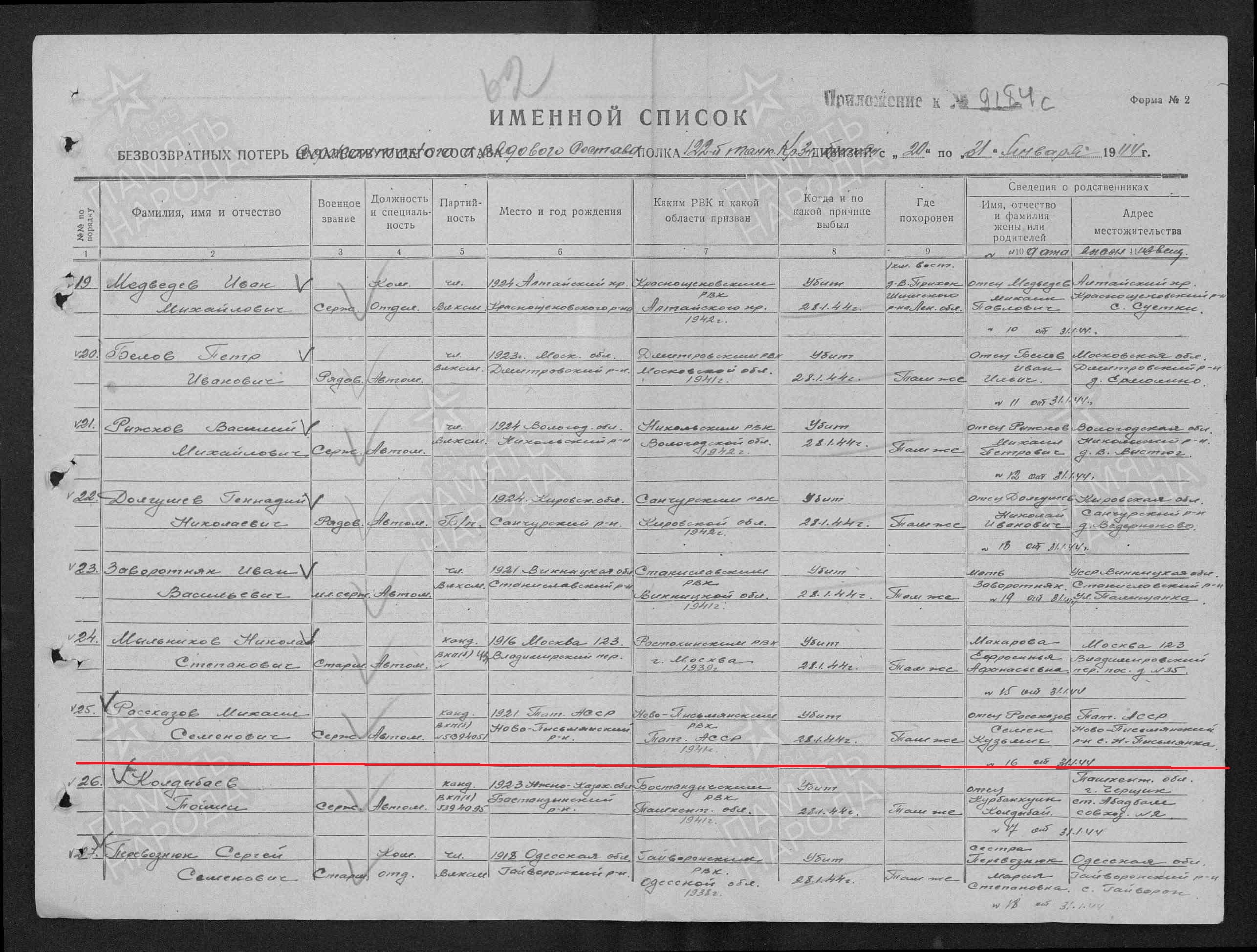 Призван 08.1941г. Ново-Письмянским РВК. Воинское звание сержант. Воинская часть 122 танковая бригада.