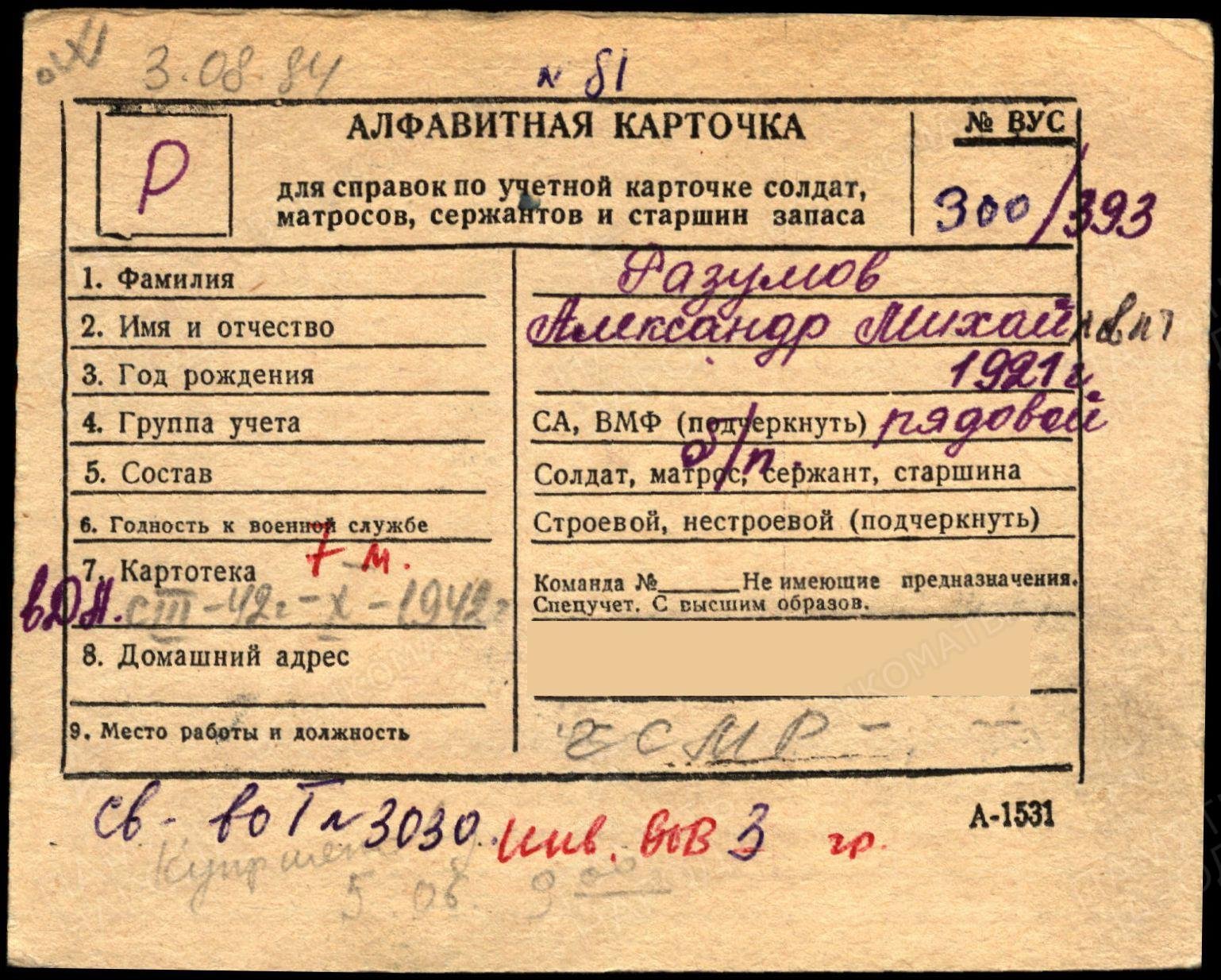Родился 15.04.1921 г. в г. Котельнич Кировской области. До армии был студентом Горьковского института инженеров водного транспорта.