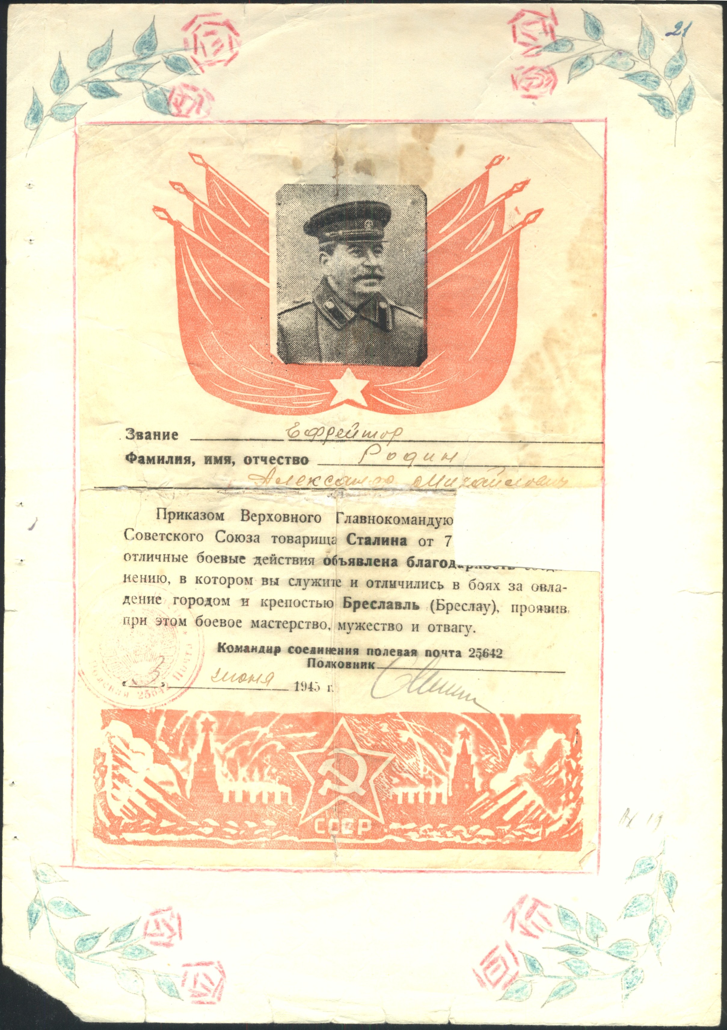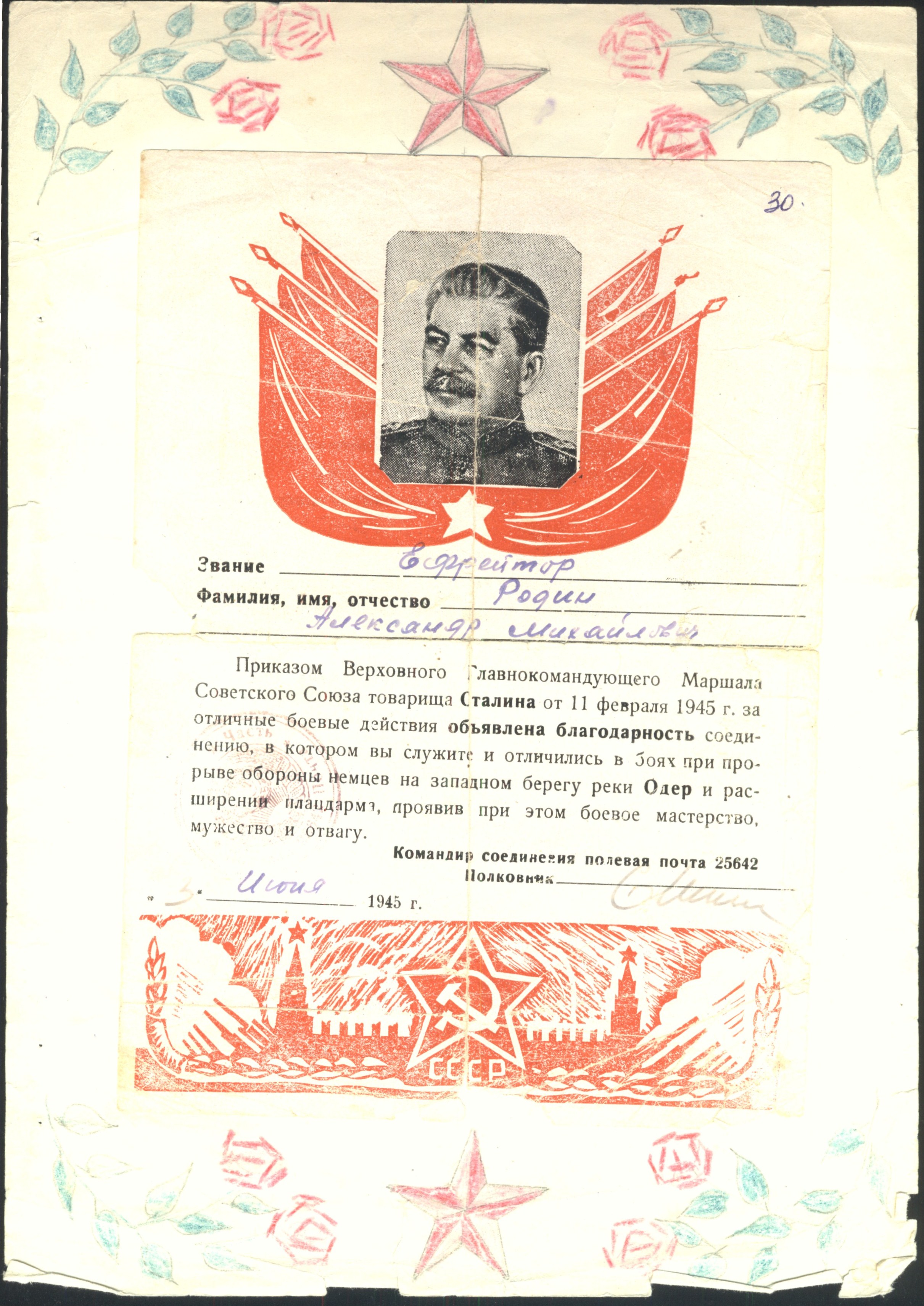 «В бою при форсировании реки Висла под сильным артиллерийско-пулеметным огнем противника, ефрейтору Родину была поставлена задача первым в плавь форсировать реку и установить телефонную связь, ефрейтор Родин хххх? приказ с кабелем и телефонным аппаратом приделав его за спину поплыл на западный берег реки, где ему угрожала смерть, с прибытием на левый берег реки установил аппарат и стал держать связь с правым берегом.