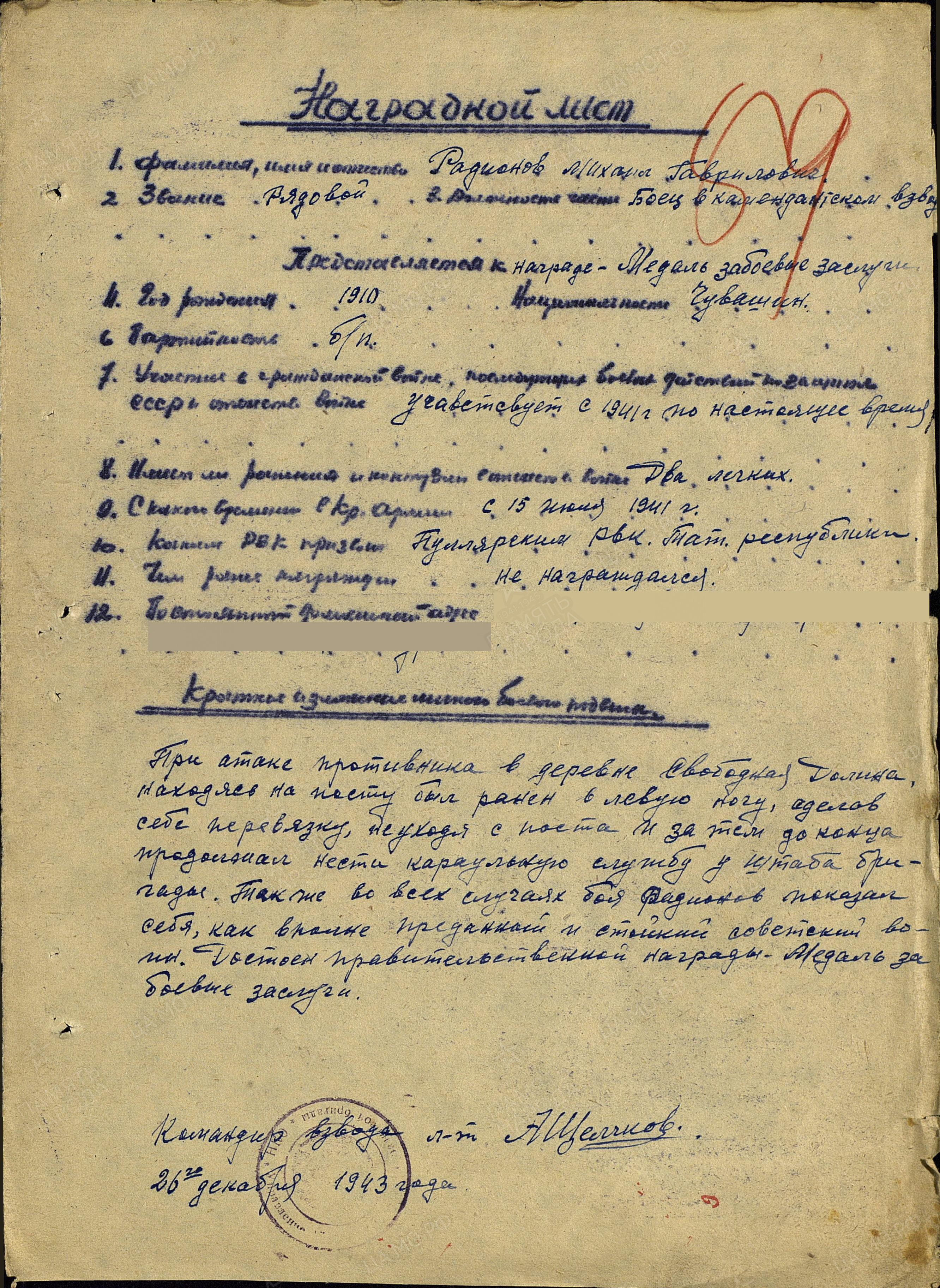 «При атаке противника в деревне Свободная Долина, находясь на посту, был ранен в левую ногу. Сделав себе перевязку, до конца продолжал нести караульную службу у штаба бригады. Так же, в боях показал себя как преданный и стойкий советский воин».