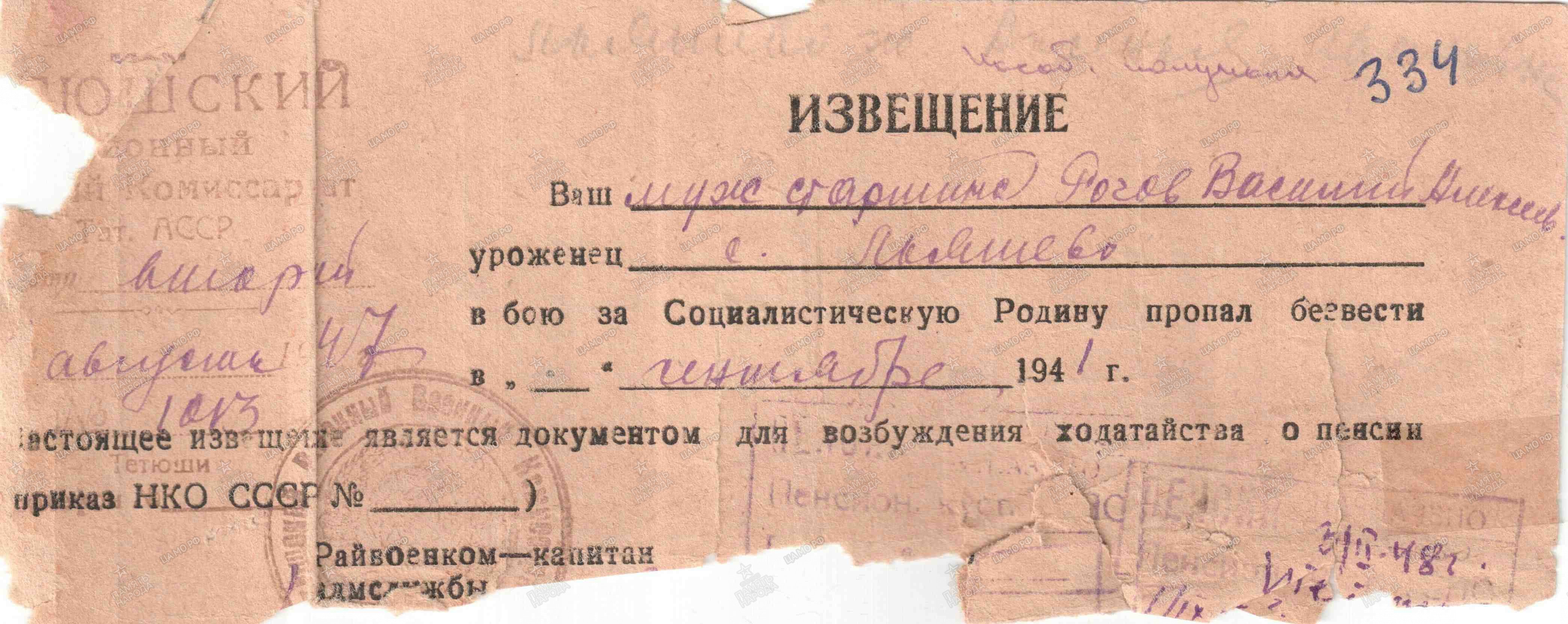 Рогов Василий Алексеевич (12.04.1915- 09.1941) - уроженец с. Льяшево Тетюшского района.