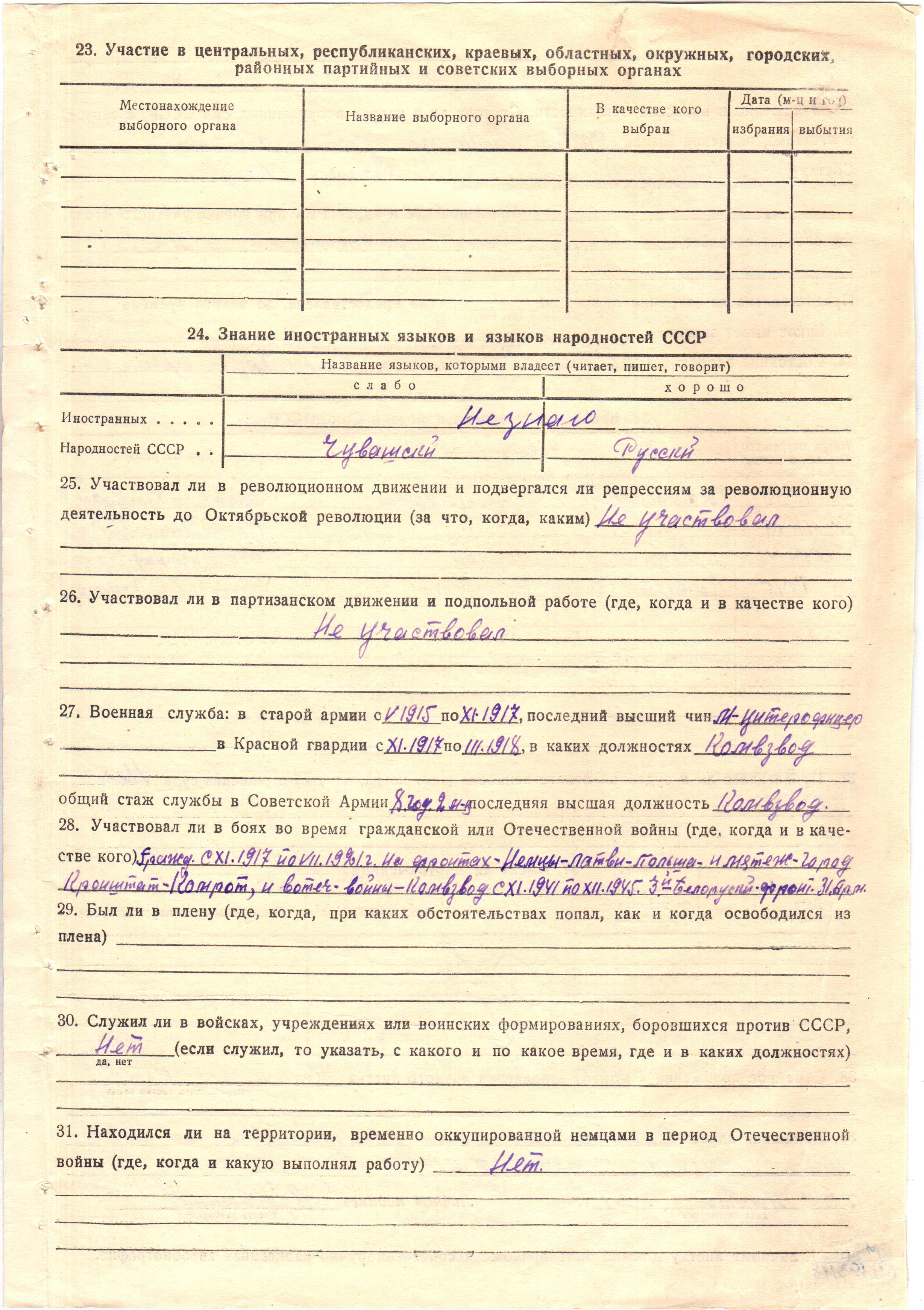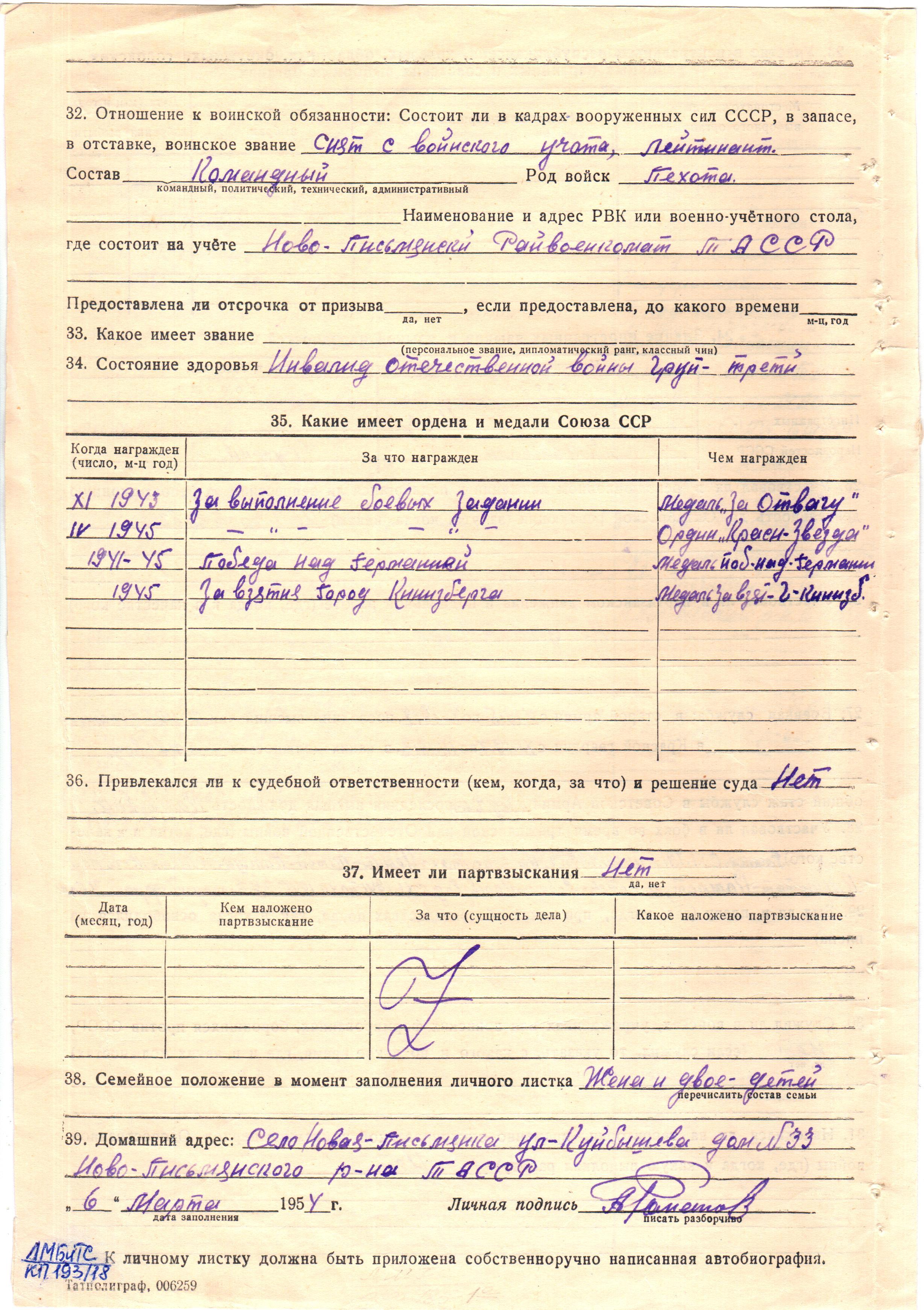 Мобилизован Ново-Письмянским РВК в 1941г. Воинское звание лейтенант командир взвода. Воинская часть 32 окср (отдельная конно-санитарная рота) 3 Белорусский фронт.