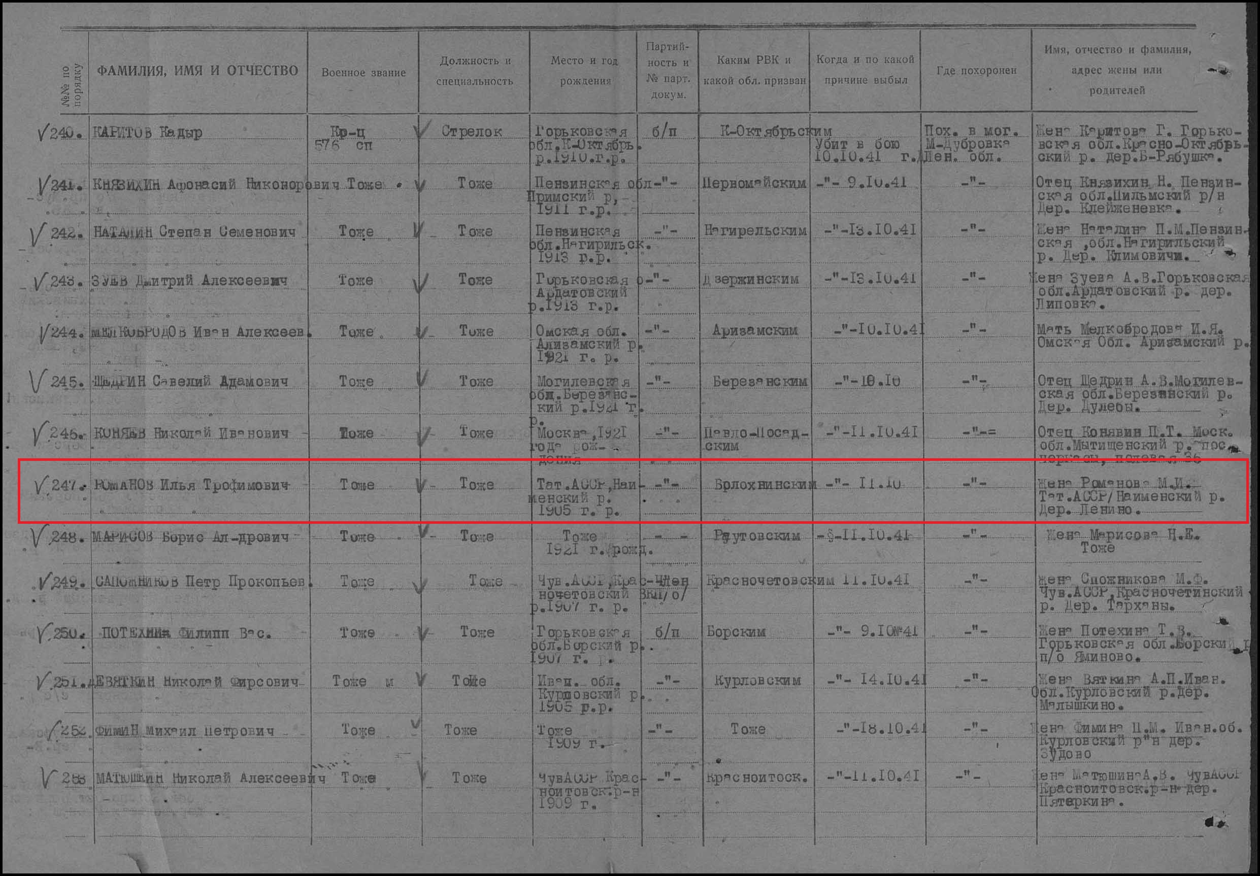Романов Илья Трофимович родился в 1905 году в с.Ленино Казанской губернии Чистопольского уезда Новошешминской волости. Мобилизован Болохнинским РВК, кр-ц, 576 сп,115 сд, погиб 11 октября 41 года, Ленинградская обл. Кировский р-н, мемориал "Невский Пятачок".