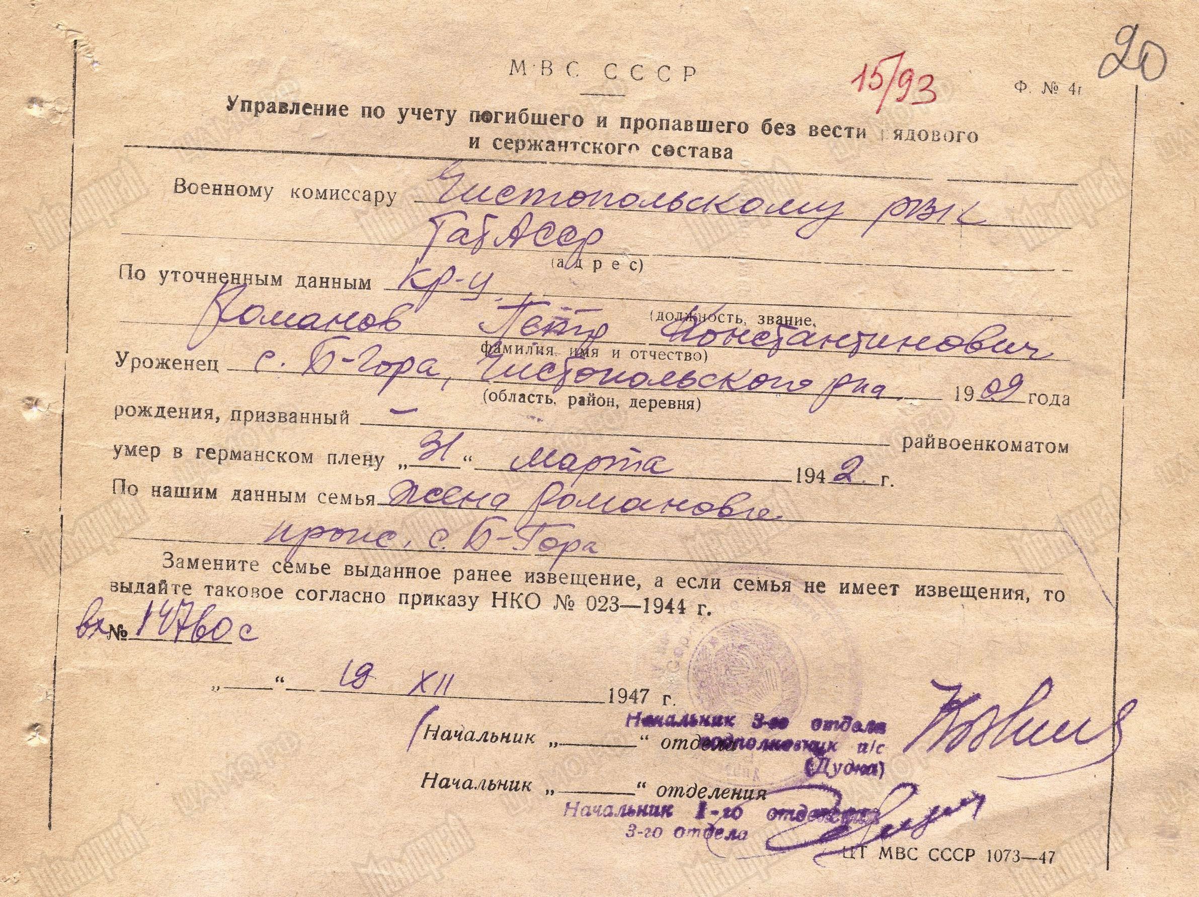 Родился 25 января 1909 г. в с. Белая Гора Чистопольского уезда. Призван 24 июня 1941 г. Чистопольским РВК. Пленен 22 июля 1941 г. под Смоленском. Содержался в шталаге II G (323). Лагерный номер 6783. Красноармеец телегафист-морзист Романов Петр Константинович погиб в плену 31 марта 1942 г. Первичное место захоронения Нойбранденбург, общая могила.