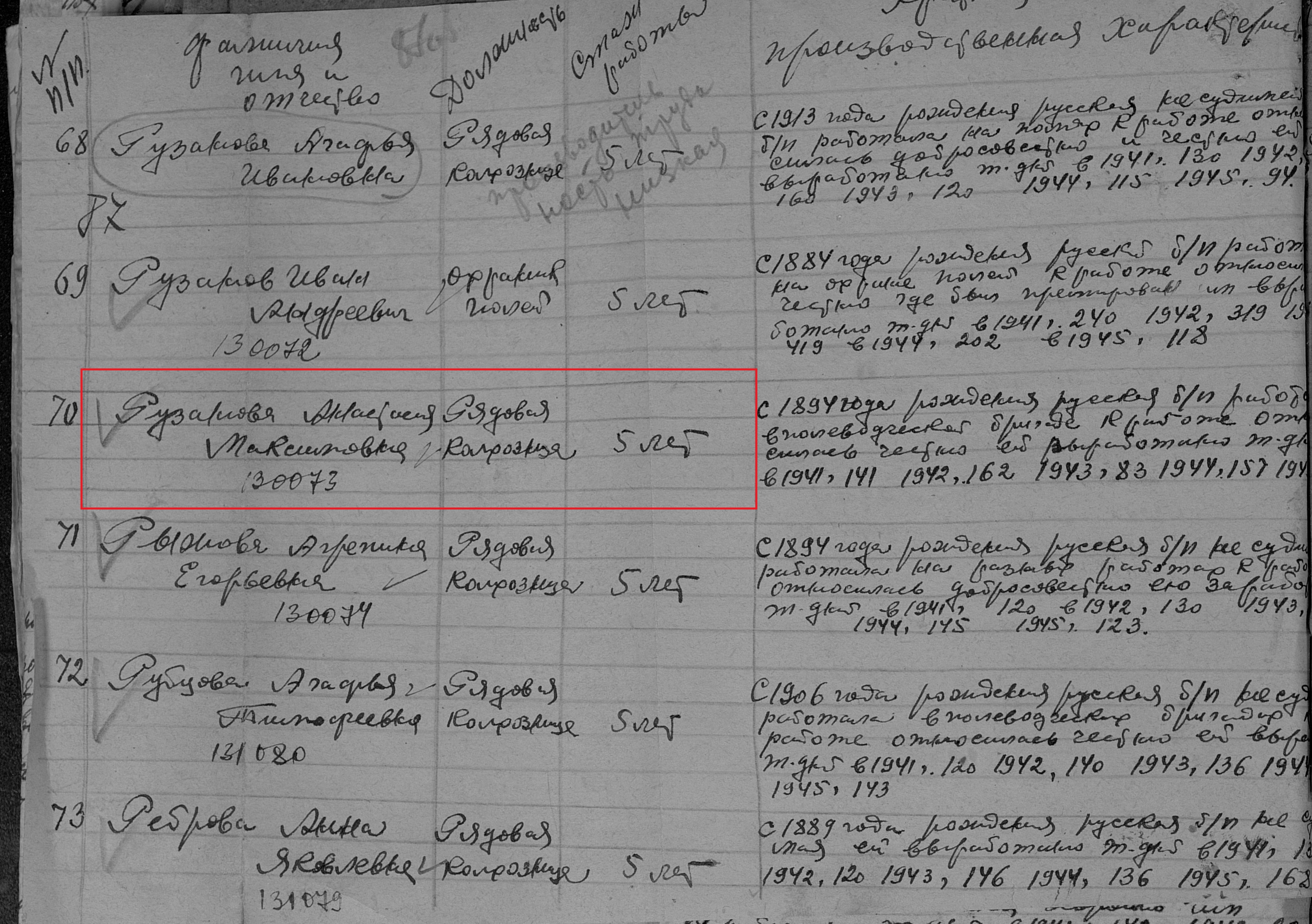 Рузанова Анастасия Максимовна родилась в 1894 году в с.Сл.Черемуховая Казанской губернии Чистопольского уезда Новошешминской волости. В годы Великой Отечественной войны работала в колхозе "8-е Марта" колхозницей. Награждена медалью "За доблестный труд в Великой Отечественной войне 1941–1945 гг." (Акт от 28 апреля 1947г., фонд 3610, опись 2, дело 325, лист 87).