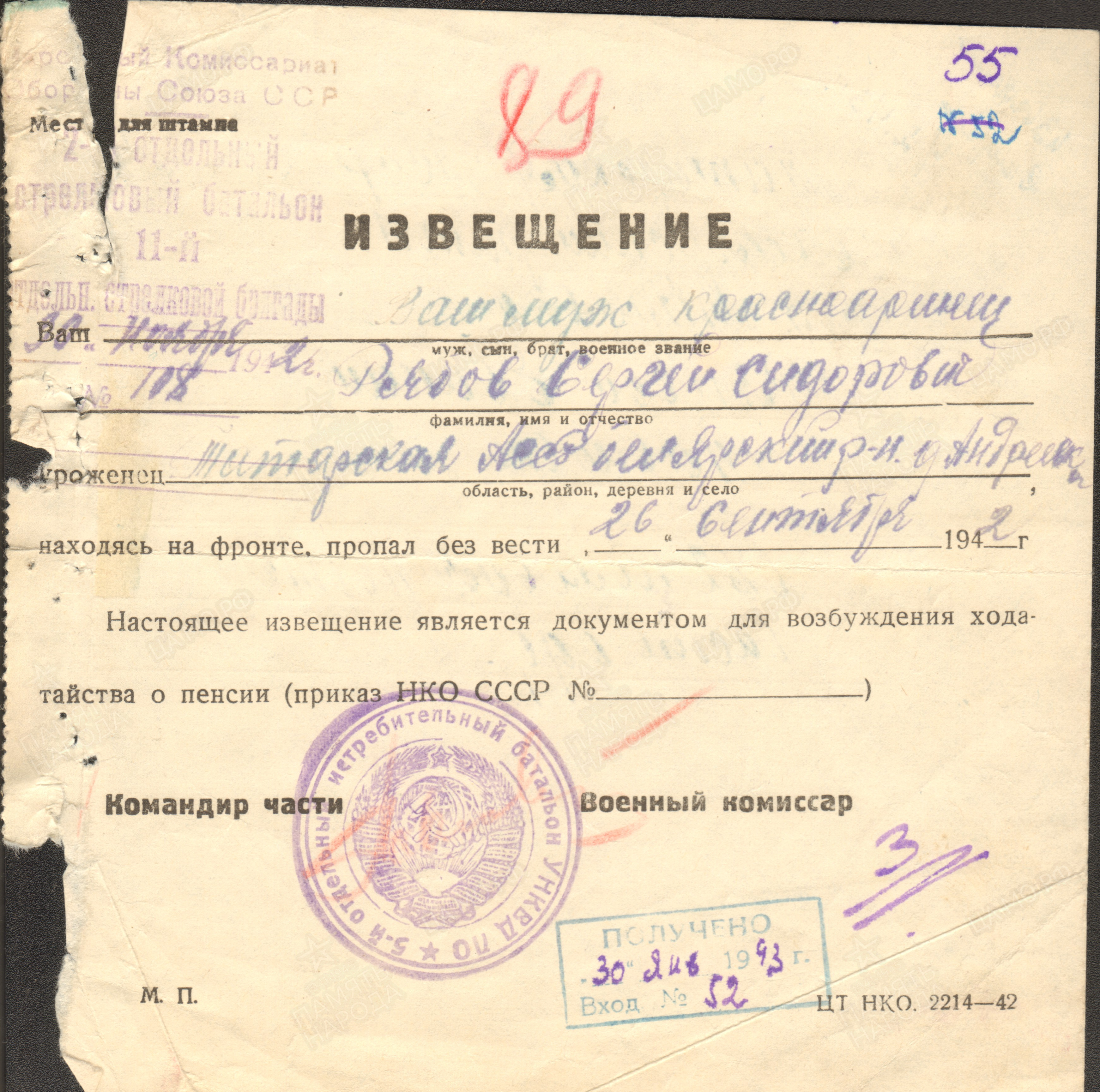 РЯБОВ Сергей Сидорович, 1907, д. Андреевка/с. Лягушкино. Мобилизован Билярским РВК. Красноармеец, связной 11 ОСБр ЛенФ. 26 сент. 1942 ошибочно учтён пропавшим без вести в районе 8 ГЭС, д. Выборгская Дубровка, Всеволожский р-н, Ленинградская обл. Награждён орденом Славы 3 ст. в 1958.
