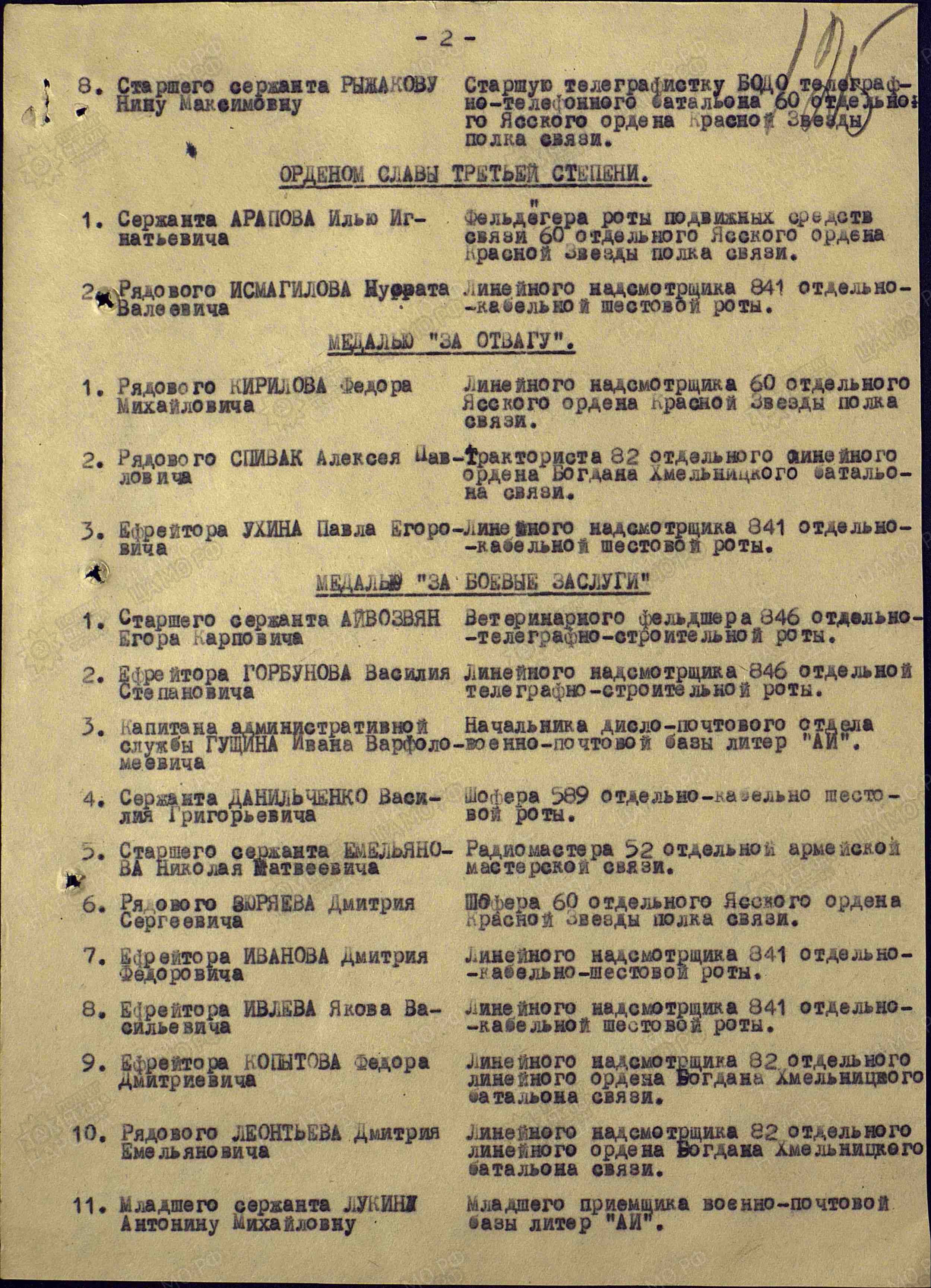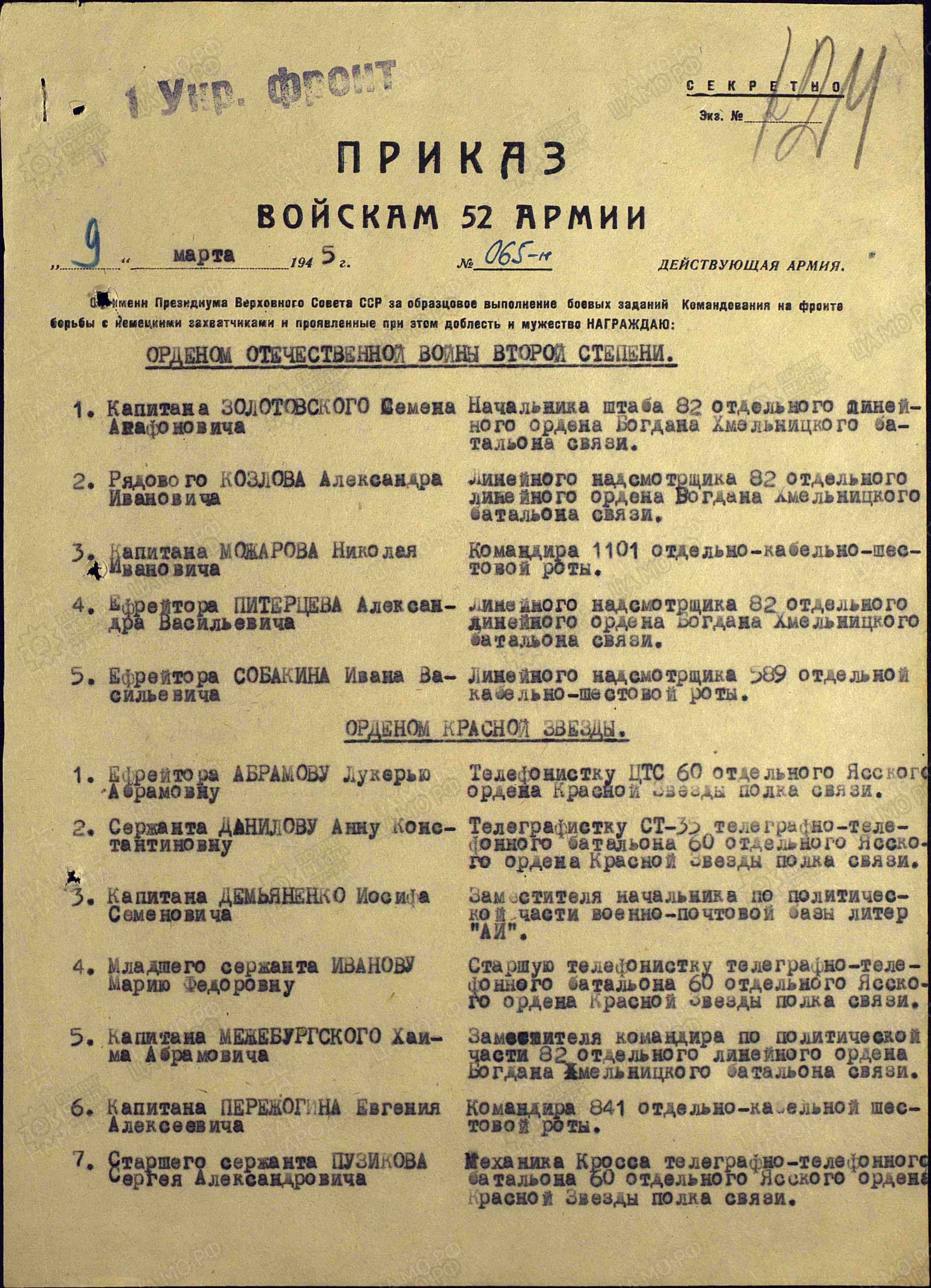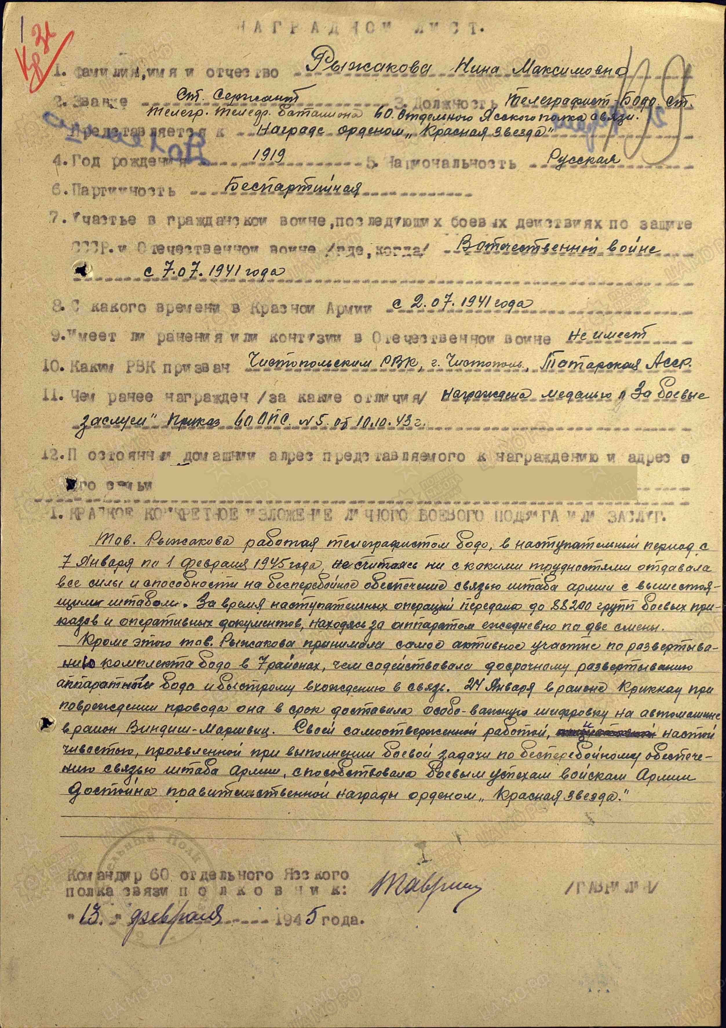 Кроме этого тов.Рыжакова принимала самое активное участие по развертыванию комплекта БОДО в 7 районах, чем содействовала досрочному развертыванию аппаратный БОДО и быстрым вхождению в связь. 24 января в районе Криккау при повреждении провода она в срок доставило особо важную шифровку на автомашине в район Виндиш-Маршвиц. Своей самоотверженной работой и настойчивостью, проявленной при выполнении боевой задачи по обеспечении связью штаба армии, способствовала боевым успехам войскам армии».