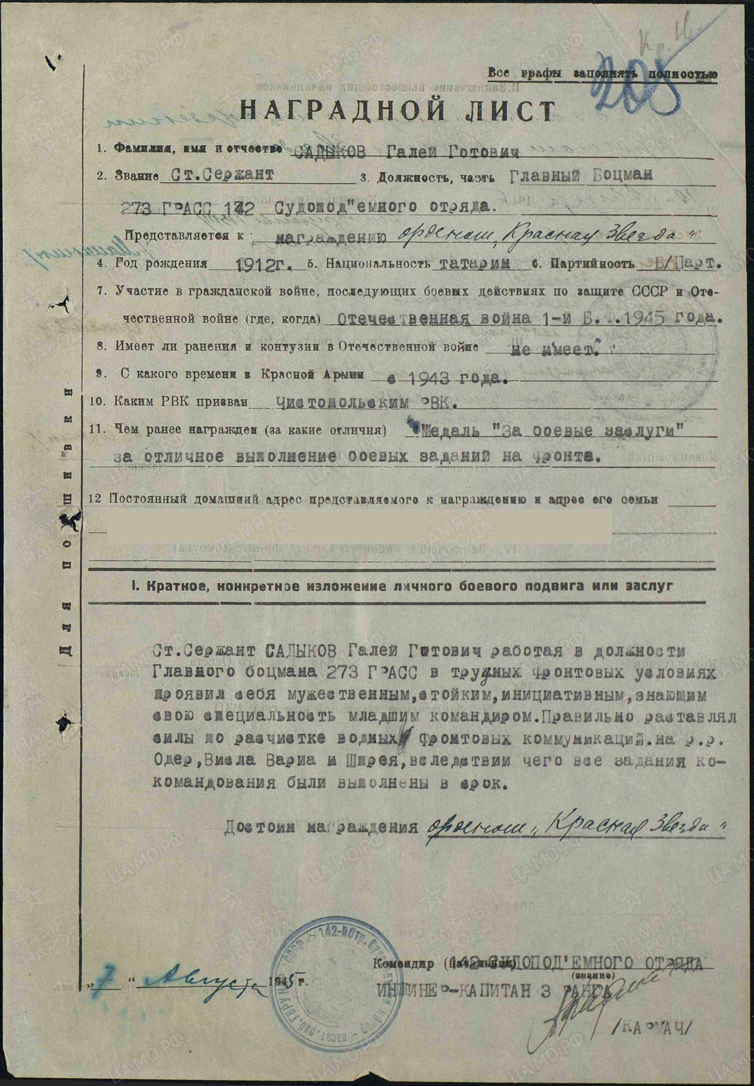 Галей Готович Садыков родился в 1912 г. в г.Чистополе, ТАССР. В 1942 г. призван в ряды Красной Армии Чистопольским военным комиссариатом. Служил в звании старшего сержанта, в должности гласного боцмана 273 ГРАСС 142 Судомодъёмного отряда.