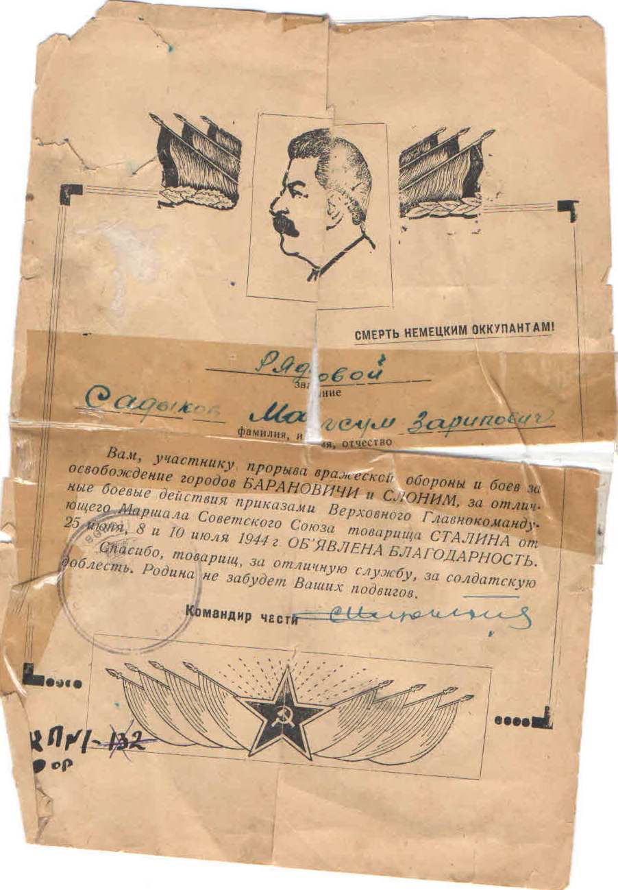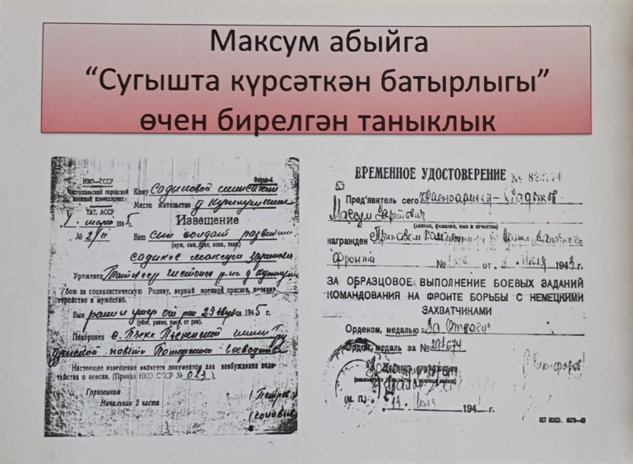 Максум Зарипович Садыков родился в 1922 г. в д.Кутлушкино Чистопольского района. Был призван в ряды Красной Армии Чистопольским РВК. Служил в 166 оиптад, 15 (69) сд. Был награжден медалью «За отвагу».
