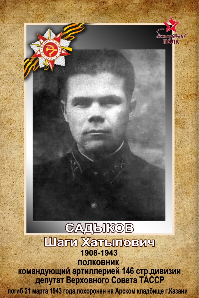 САДЫ́КОВ Шагиахмет (Шаги) Хатыпович (1908, с.Каргополь Спасского у. Казан. губ., ныне Алькеевского р-на РТ — 21.03.1943, д.Чебыши Спас-Деменского р-на Смоленской, ныне Калужской обл.), участник Вел. Отеч. войны. В Кр. Армии с 1926, кадровый военный. Перед войной избирался депутатом ВС ТАССР. Воевал с 23 июня 1941 на Западном фронте. Полковник, зам. командира, начальник артиллерии 146-й стрелк. дивизии. Солдаты дивизии с любовью называли С. отцом артиллерии, дивизионный поэт Александр Лесин выразил это в своей «Песне о полковнике Садыкове». За умелое руководство боем артиллерийского полка в июле 1941 был представлен к ордену Ленина. Под руководством С. артиллерия дивизии за время обороны разрушила несколько десятков вражеских дзотов, уничтожила не одну сотню гитлеровцев. В июле, августе и октябре 1942, когда противник делал попытки прорвать нашу оборону, артиллеристы дивизии под руководством С. своим метким огнём нанесли врагу большие потери и заставили его отойти на исходные позиции. Убит в бою на наблюдательном пункте в р-не дд.Чебыши и Старинки. Похоронен в Казани на Арском кладбище. Награждён орденом Красного Знамени (1943).