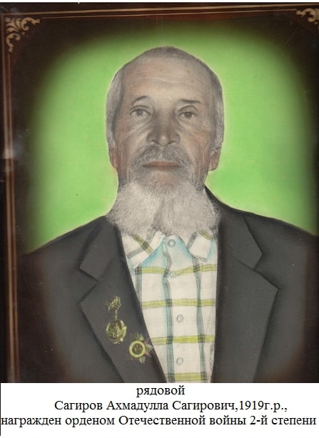Сагиров Ахмадулла Сагирович родился в 1919 году в селе Старое Камкино Спасского уезда Казанской губернии (ныне Алькеевского р-на РТ). Участник Великой Отечественной войны. Призван Алькеевским РВК ТАССР в 1939 году. Умер в 2005 году.