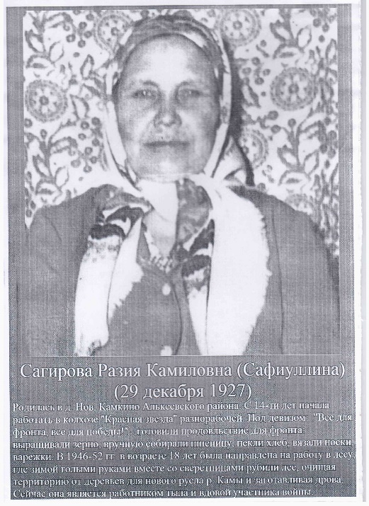 Сагирова (Сафиуллина) Разия Камиловна (р.29.12.1927, д. Новое Камкино Спасского кантона ТАССР (ныне Алькеевского района РТ -?). Труженица тыла, вдова участника войны. С 14 лет начала работать в колхозе «Красная звезда» разнорабочей. Под девизом «Все для фронта, все для Победы!» готовили продовольствие для фронта: выращивали зерно, вручную собирали пшеницу, пекли хлеб, вязали носки, варежки. В 1946-52 годах, в возрасте 18 лет была направлена на работу в лес, где вместе со сверстниками рубили лес, голыми руками очищая территорию от деревьев для нового русла реки Кама, заготавливали дрова. (Материал БМСОШ Алькеевского района).