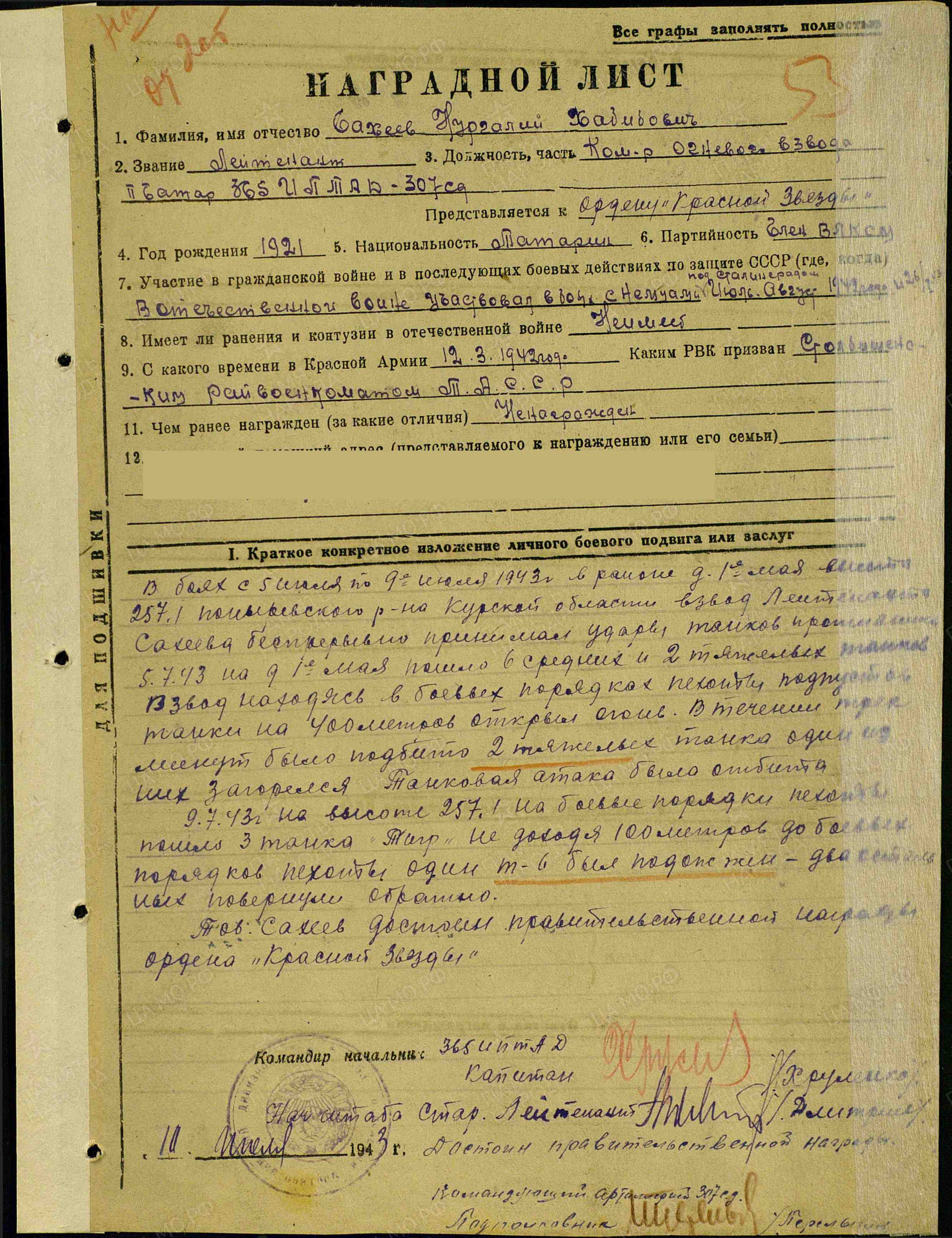 САХЕЕВ (САХИЕВ) Нургалей Хабибович, 1921, с. Ошняк. Жил в с. Столбищи. Мобилизован 12 марта 1942 Столбищенским РВК. Принимал участие в битве под Сталинградом в июле-августе 1942. В 1943 – лейтенант, ком. огневого взвода 365 ИПТАДн 307 СД 13 А Брянского/ Центрального фронта. Участник битвы на Курской дуге. 5 июля 1943, в бою за д. Первомайское (1 мая), Курская обл., взвод под командованием Сахеева подбил два тяжёлых танка противника и отбил атаку. 9 июля 1943, в бою за выс. 257,1, взвод подбил танк Т-6 «Тигр». Награждён орденом Отечественной войны 2 ст. Перенёс ранение. Проходил лечение в ЭГ 2784, г. Бугульма. Уволен в запас 24 авг. 1946 в звании "ст. лейтенант".