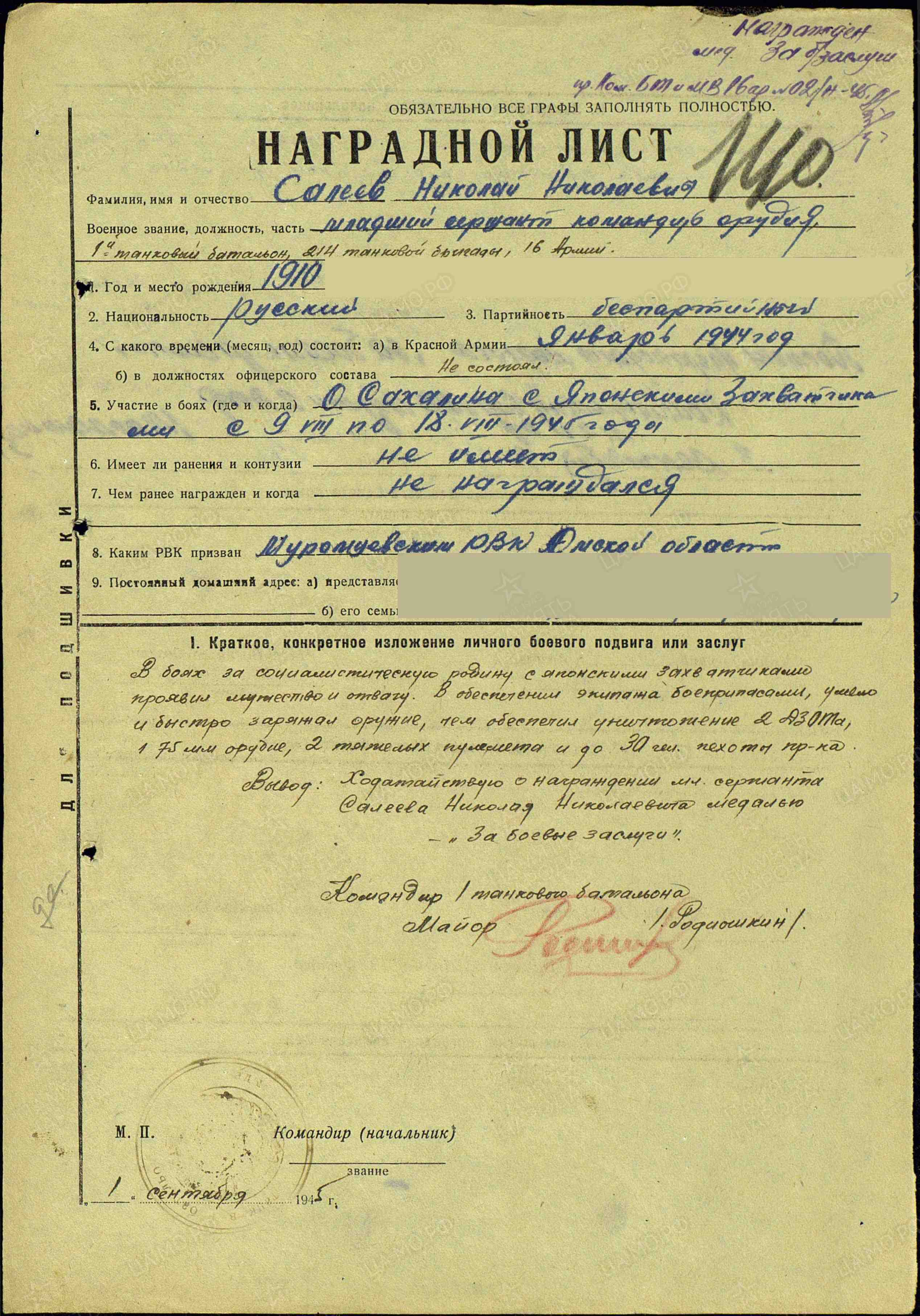Из наградного листа: «В боях за социалистическую родину с японскими захватчиками проявил мужество и отвагу. В обеспечении экипажа боеприпасами, умело и быстро заряжал оружие, чем обеспечил уничтожение 2 дзота, 1 75 мм орудия, 2 тяжелых пулемета и до 30 чел. пехоты противника».