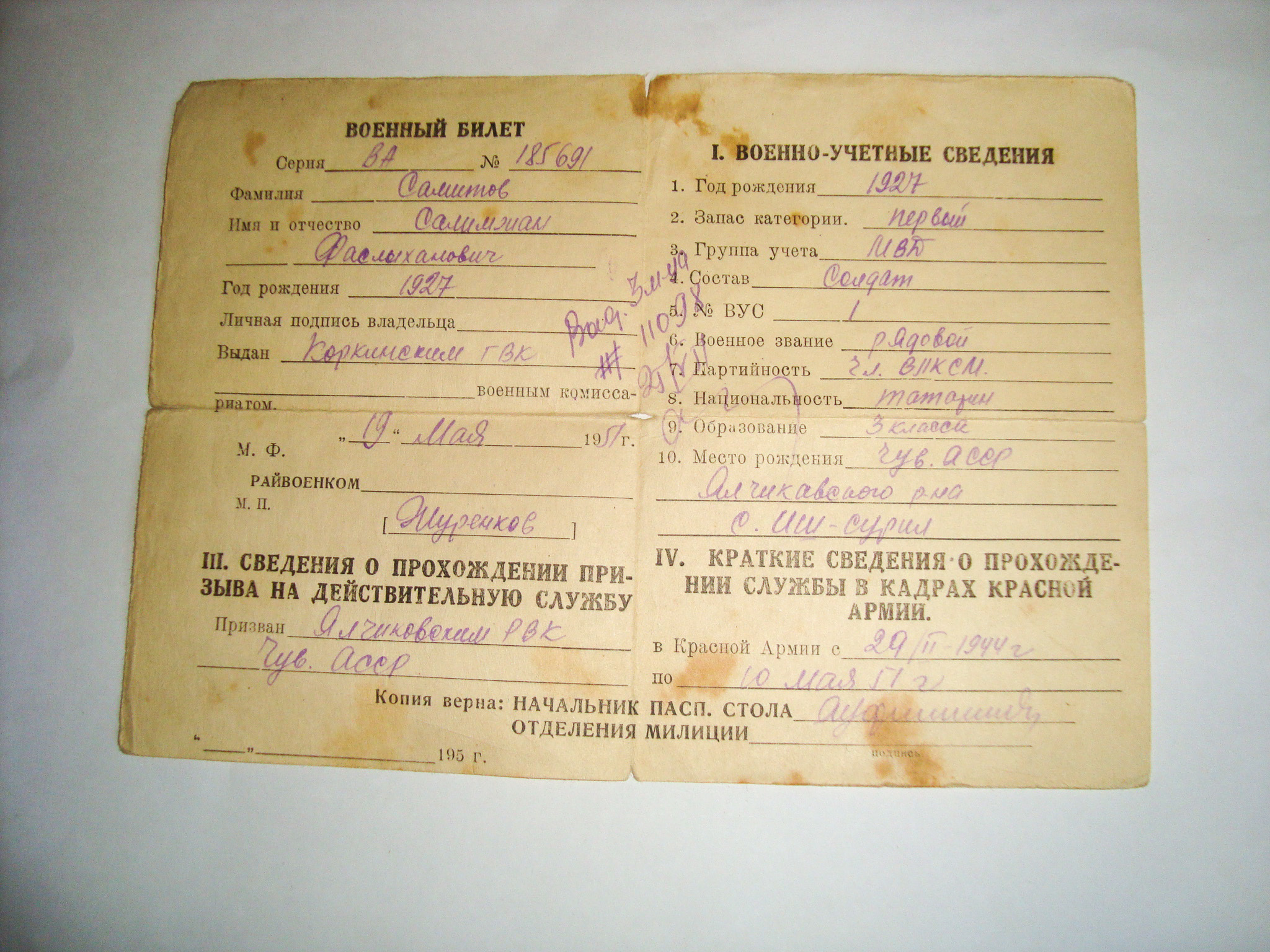 В годы Великой Отечественной войны жители Буинского района достойно выполнили свой патриотический долг в тылу и на фронте. Самитову Салимзяну посчастливилось вернутся домой живым и здоровым.