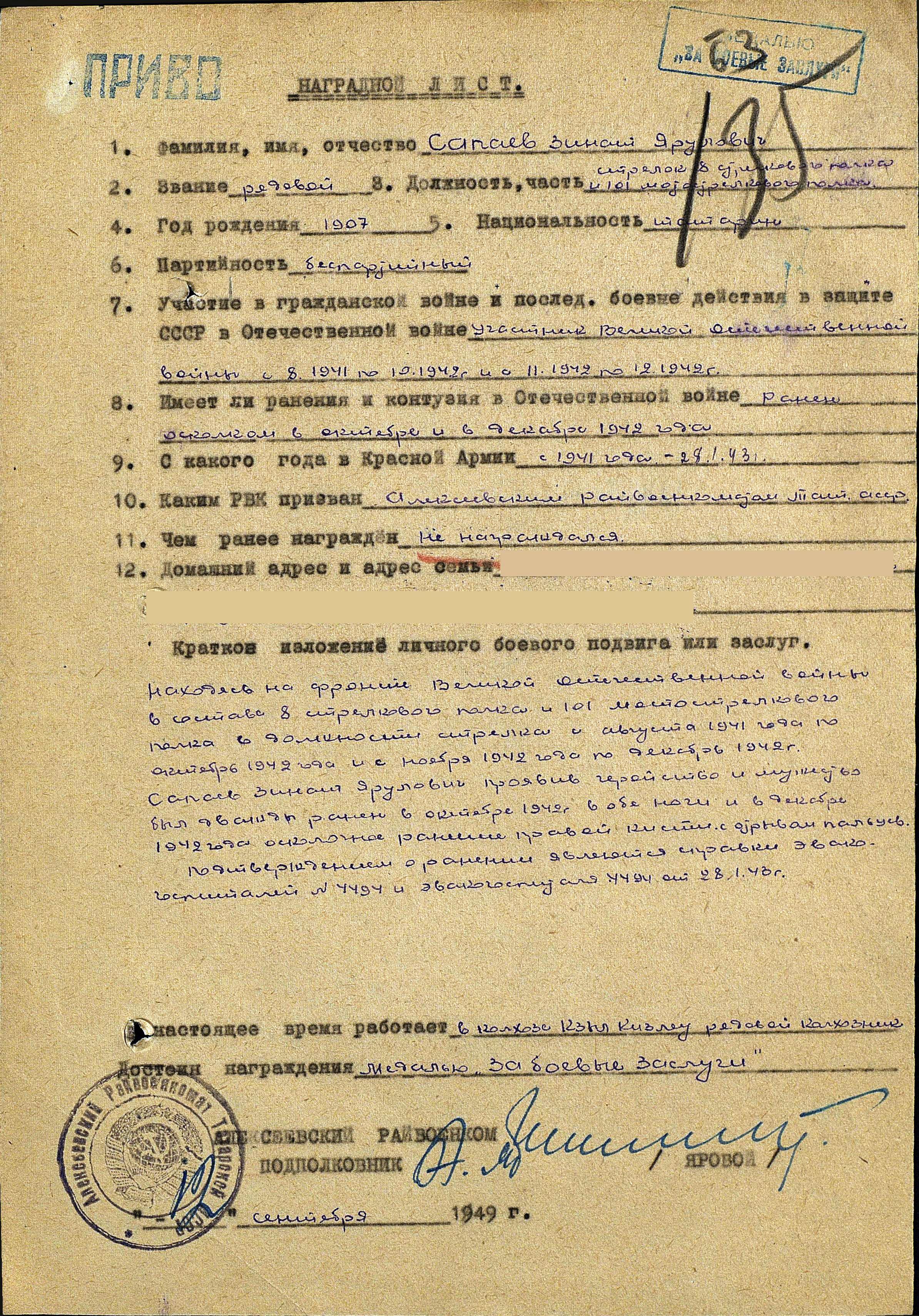 САПАЕВ (ГАЙНУЛЛИН) Зиннат Яруллович, 1907 г., с. Сухие Курнали. Мобилизован Алексеевским РВК летом 1941 г. На фронте с августа 1941 г. По данным наградного листа к медали "За боевые заслуги" от имени военкома Алексеевского района ТАССР ПривВО от 12 сентября 1949 г. он служил рядовым красноармейцем в 8 стрелковом полку до 6 октября 1942 г., получил ранение в обе ноги, в ноябре воевал в 101 мотострелковом полку, 6 декабря 1942 г. получил осколочное ранение в правую кисть с ампутацией пальцев. Находился на излечении в эвакогоспитале №4494 г. Казани до 28 января 1943 г, после чего комиссован из армии. Рядовой колхозник к-за "Кызыл Кизляу". После войны ветеран и вся его семья носили фамилию Гайнуллины. Скончался в 1982 г.