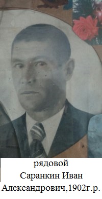 Саранкин Иван Александрович родился в 1902 году в селе Старые Матаки Алькеевского района ТАССР. Фронтовик. Участник Великой Отечественной войны 1941-1945гг. Призван Алькеевским РВК ТатАССР в 1941 году. Погиб в 1942году. (Фотография и материалы предоставлены Салманским сельским поселением)